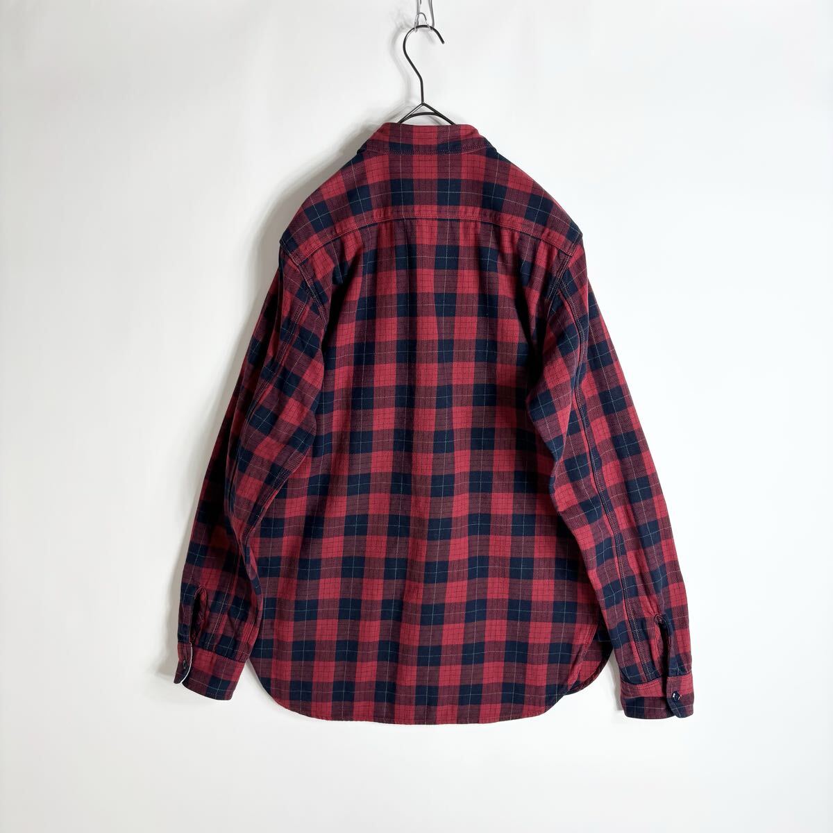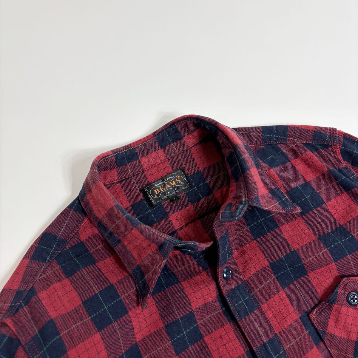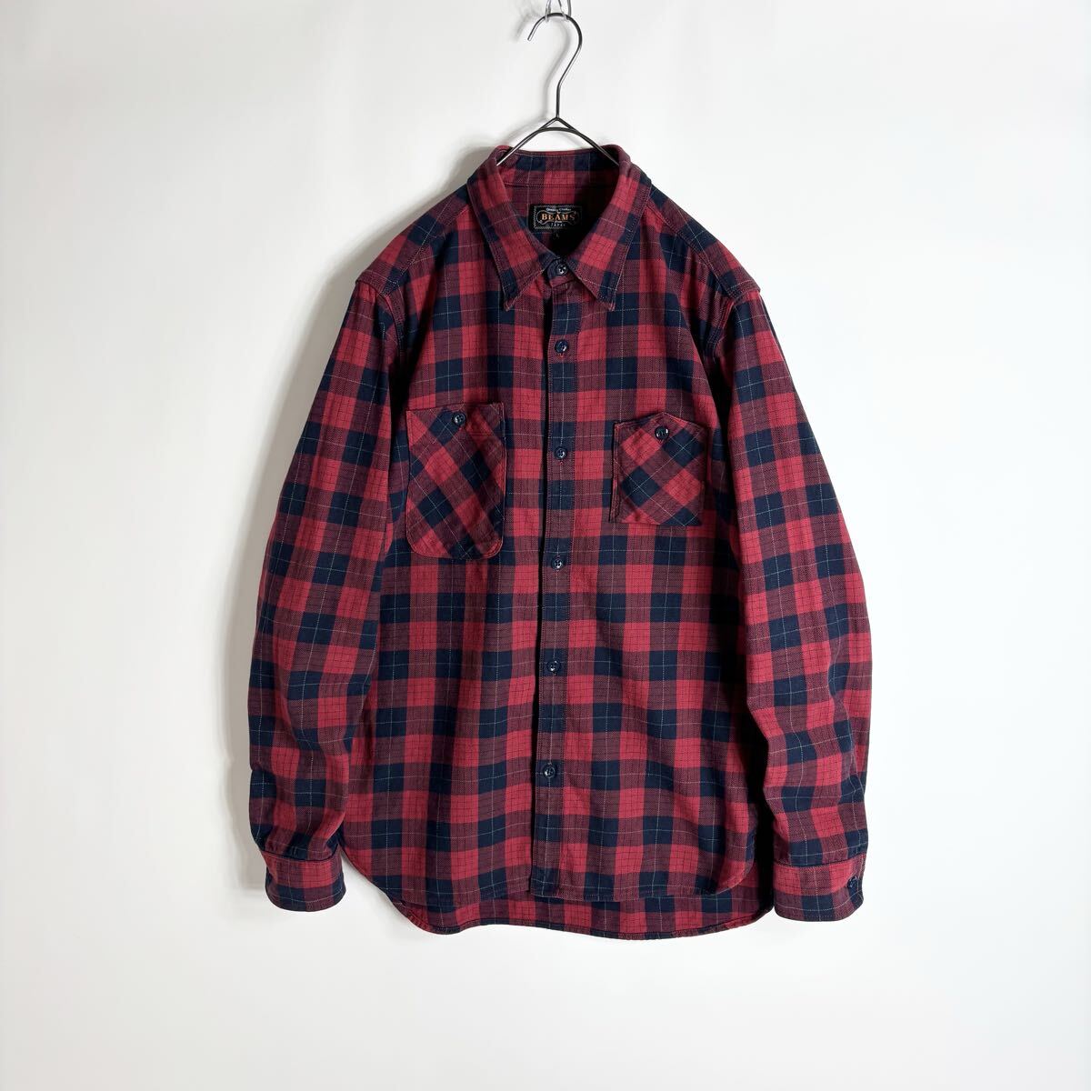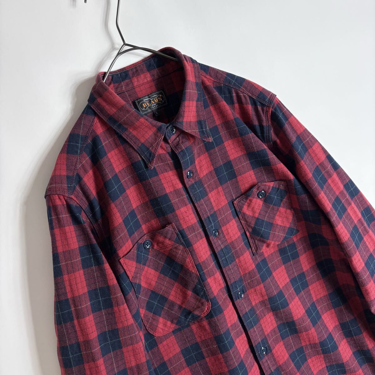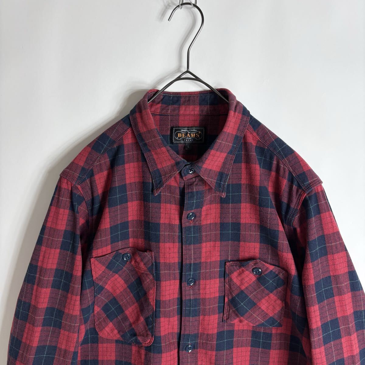 BEAMS PLUS ビームスプラス ワークシャツ チェック柄 コットン 山ポケ 3針ステッチ レッド × ネイビー size L