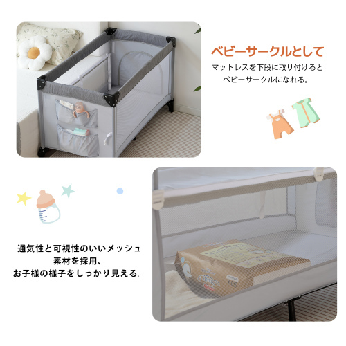 • 【ベビーサークルとして使用でき】マットレスを下段に取り付けるとベビーサークルになります。通気性と可視性の良いメッシュ素材を採用して、お子様の様子をしかり見えます。