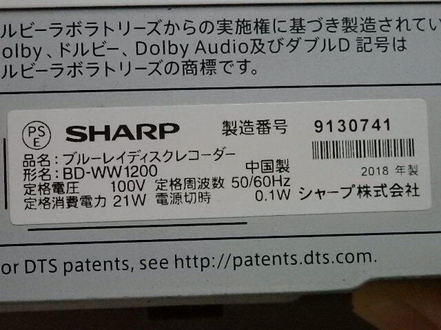 !△ブルーレイ ディスク レコーダー SHARP BD-WW1200 2018年製 シャープ Blu-ray/HDD 1.0TB/電通有り