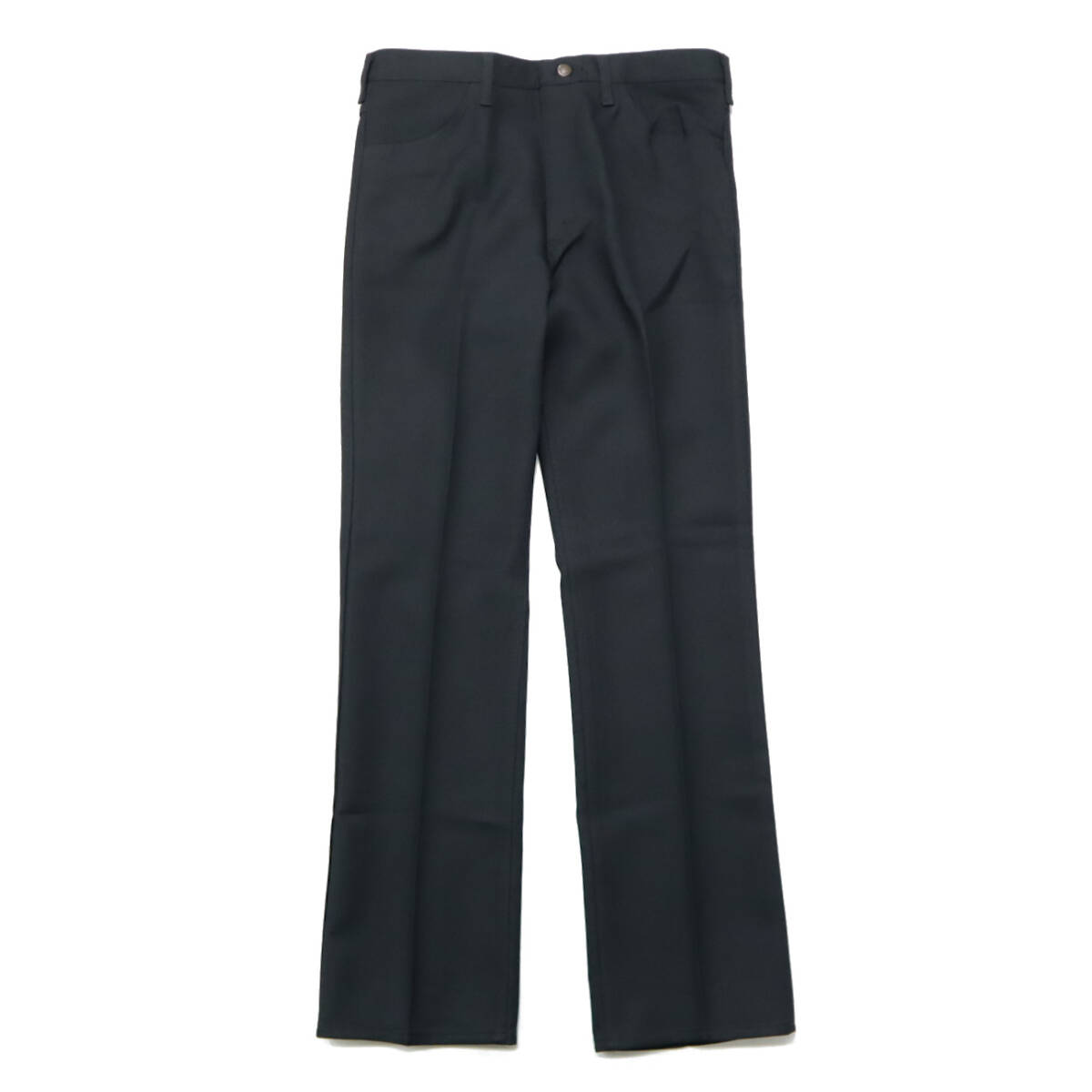 ラングラーのランチャーブーツジーンズです。1980年代のUSA製で、デッドストックです。ジッパーはTALON42です。シルエットはレギュラーフィット ブーツカット、裾は膝と比べて1㎝以内の広がりと、わりかしストレートに近いシルエットです。色は人気の黒、オールポリエステルの素材も今の気分に合っています。希少な1980年代のデッドストック、この機会に是非ご検討下さい。