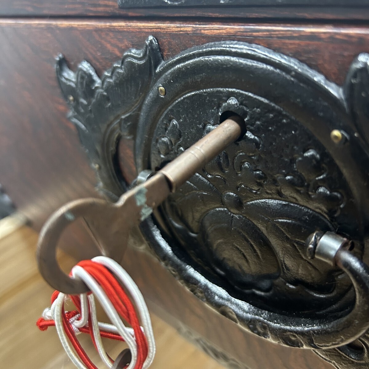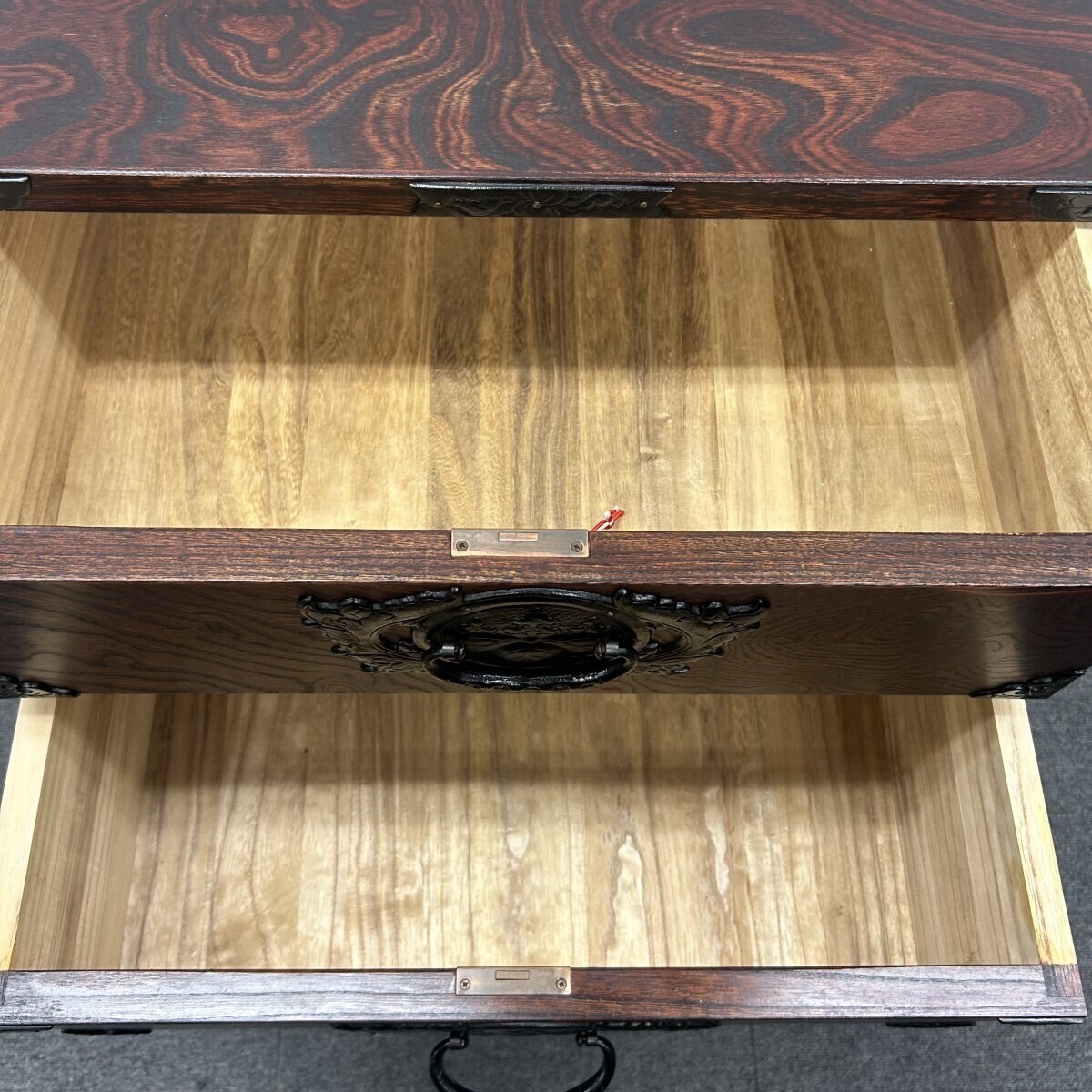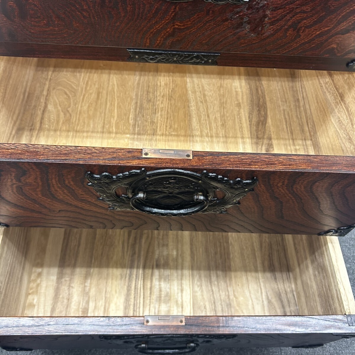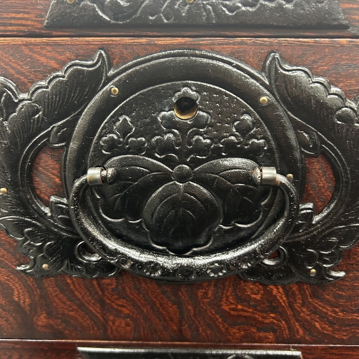 岩谷堂箪笥の大きな特徴の一つの鮮やかに浮き彫りされた南部鉄金具が凄く素敵です。