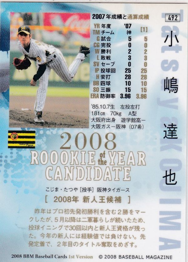 ●2008BBM/1st 【小嶋 達也】 2008 新人候補 No.492:阪神