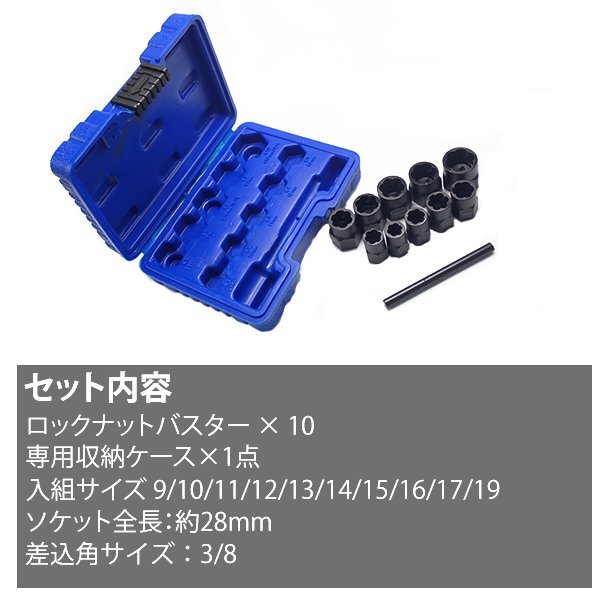 | ロックナットバスター ツイストソケット ロックナット外しソケット 10個セット 差込角 3/8 入組サイズ 9/10/11/12/13/14/15/16/17/19mm | |
