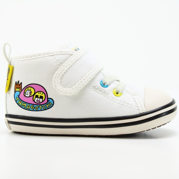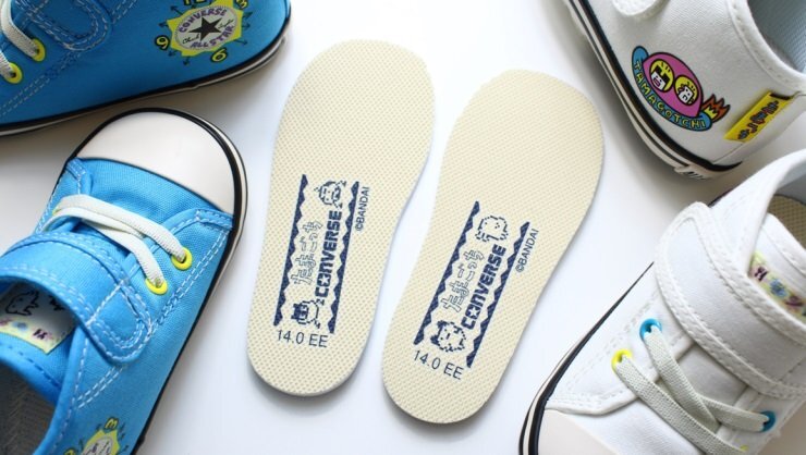 印象的な液晶画面を再現したオリジナルの織ネームをタンに採用し、たまごっちの文字を入れたピスネームを踵に付加。