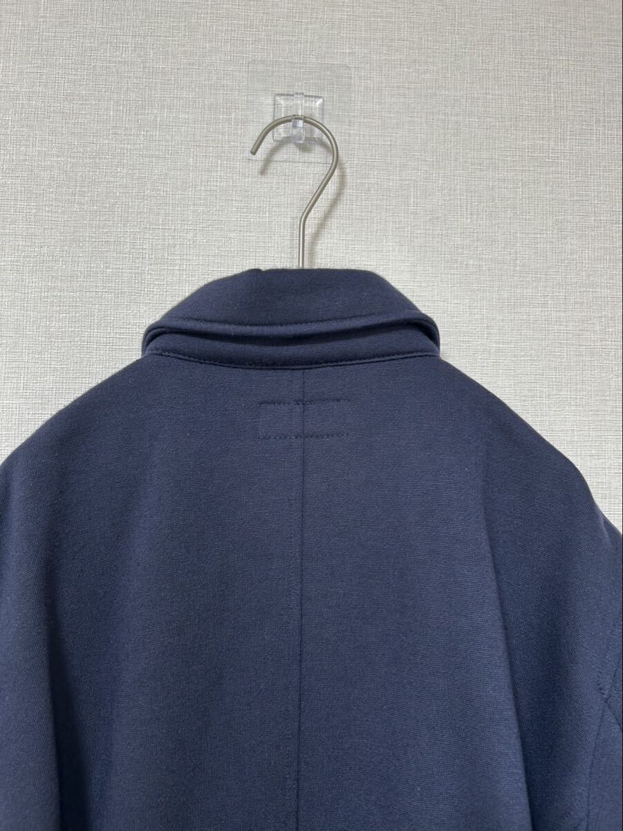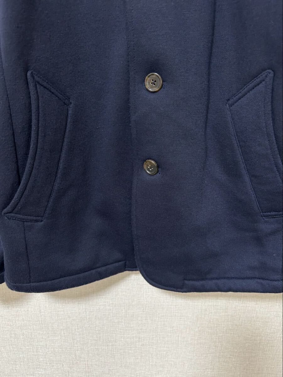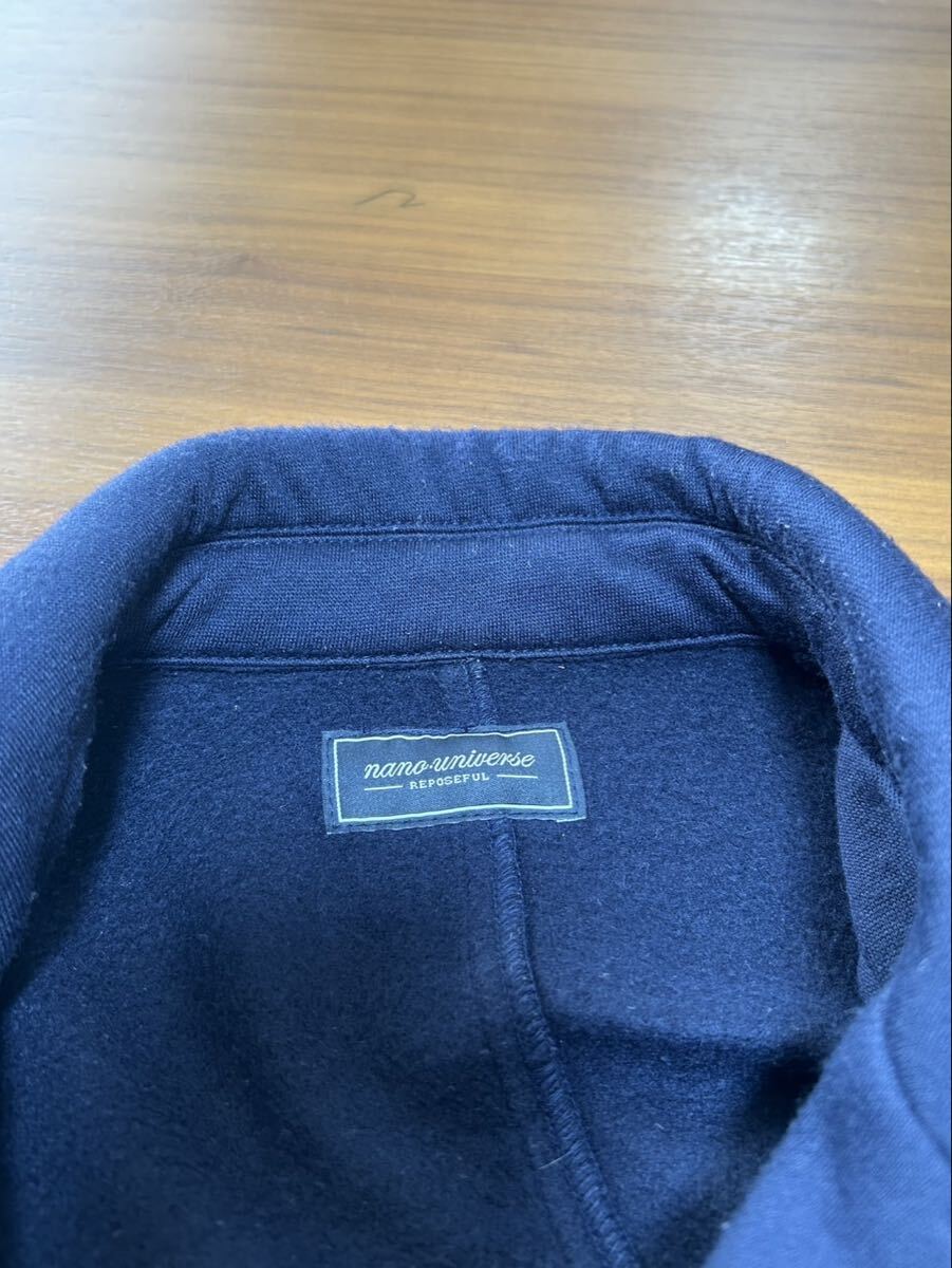 フリース素材のネイビーのジャケット、ボタン付きでポケットもあり、カジュアルなスタイルに最適です。