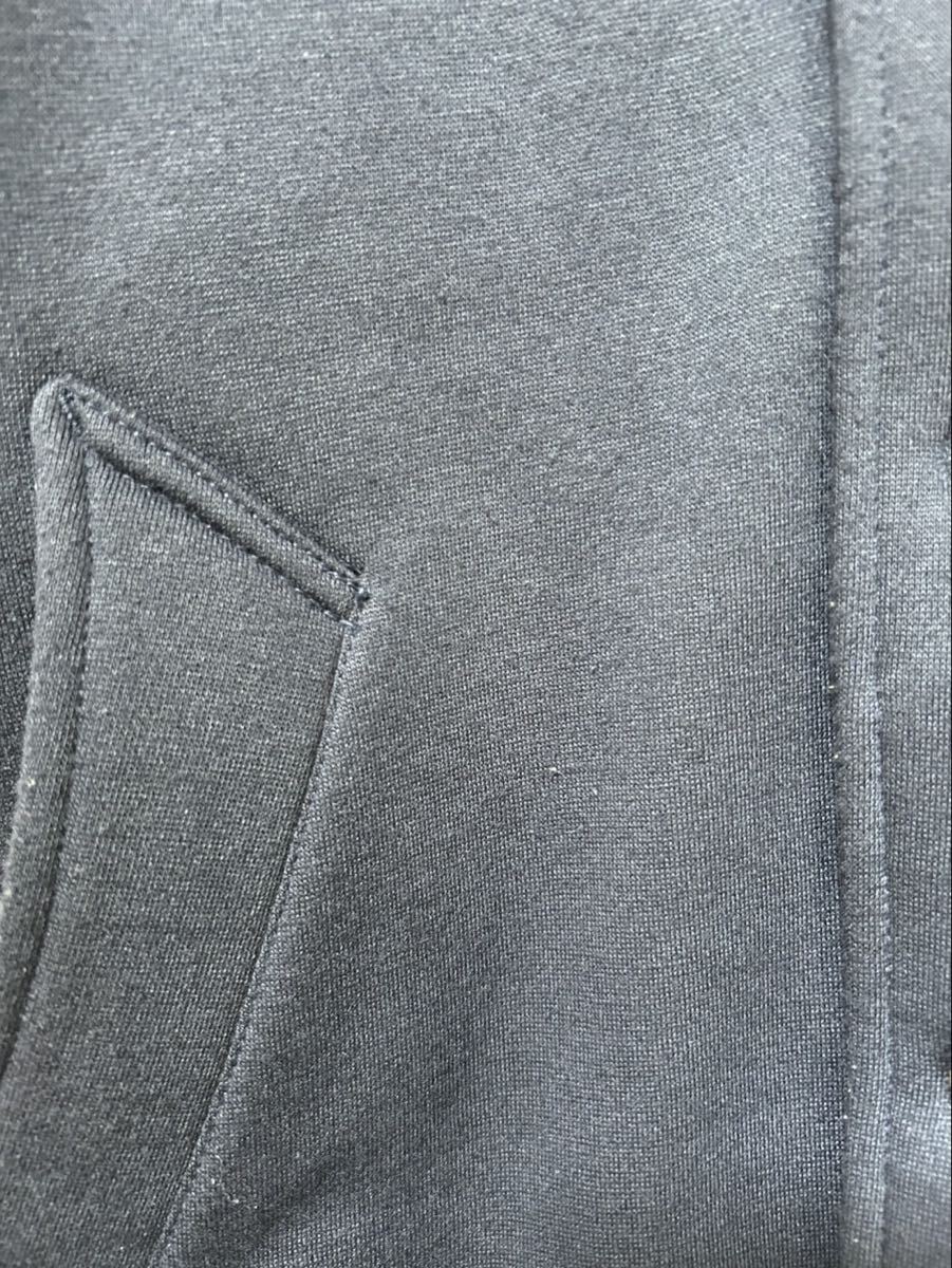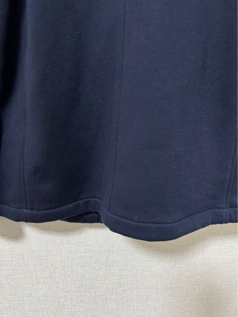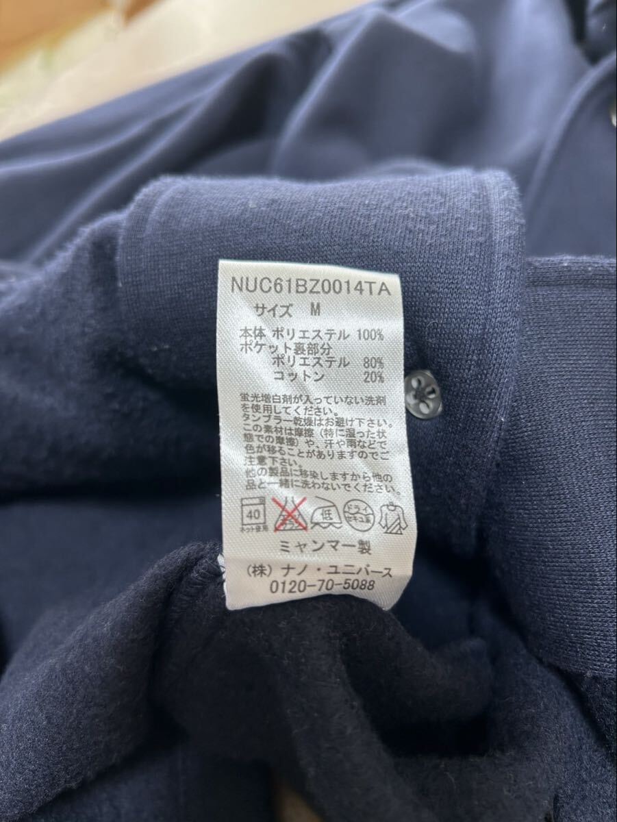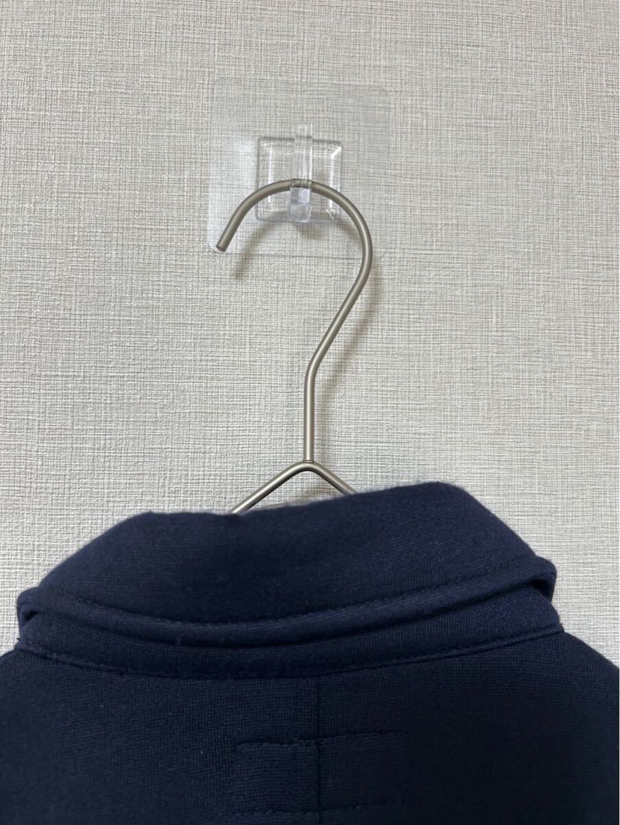 フリース素材のネイビーのジャケット、ボタン付きでポケットもあり、カジュアルなスタイルに最適です。