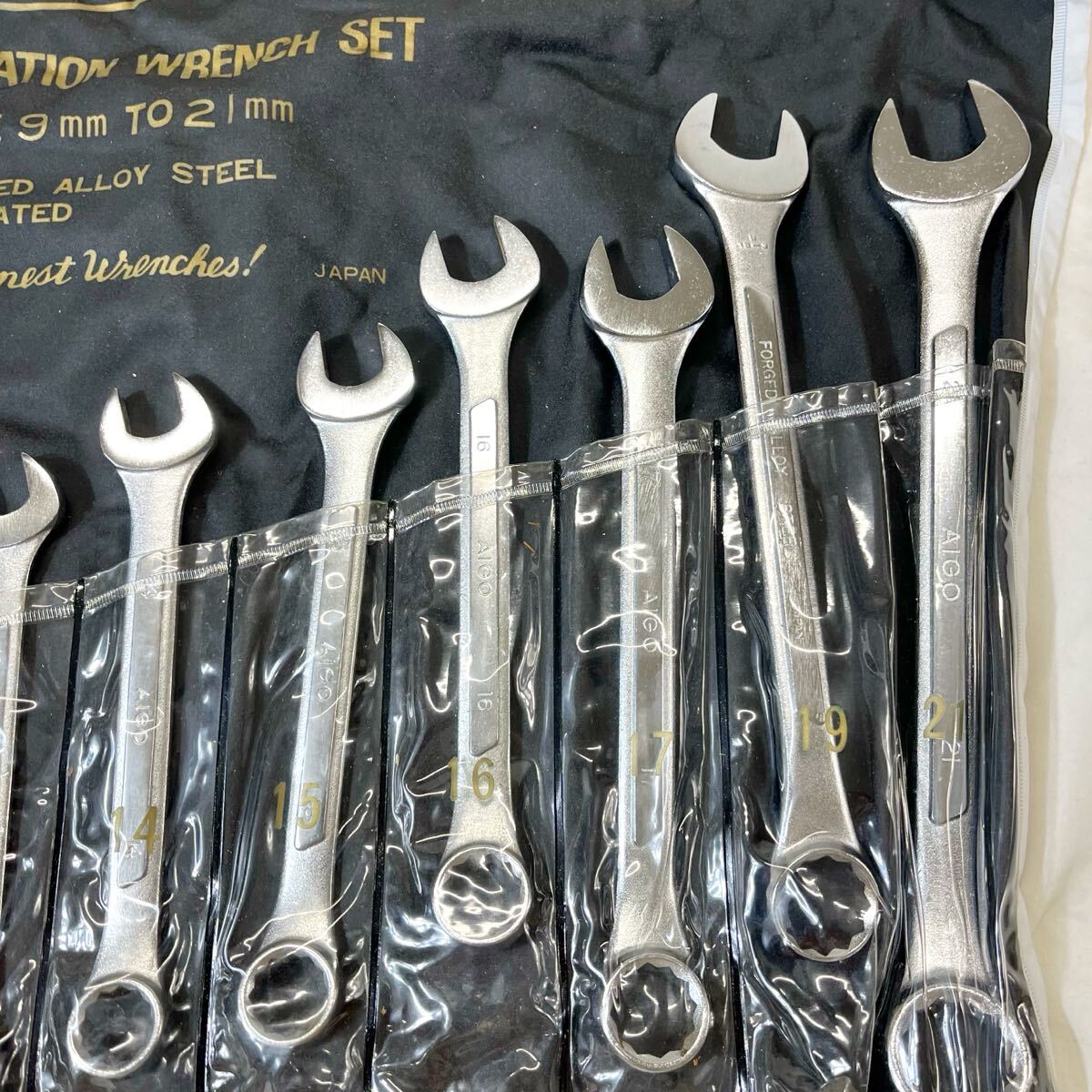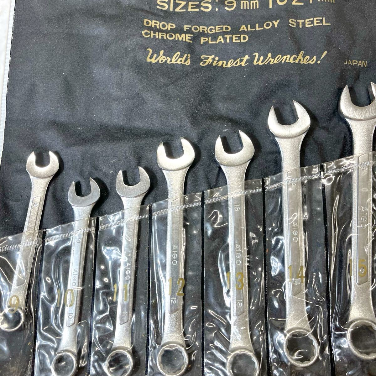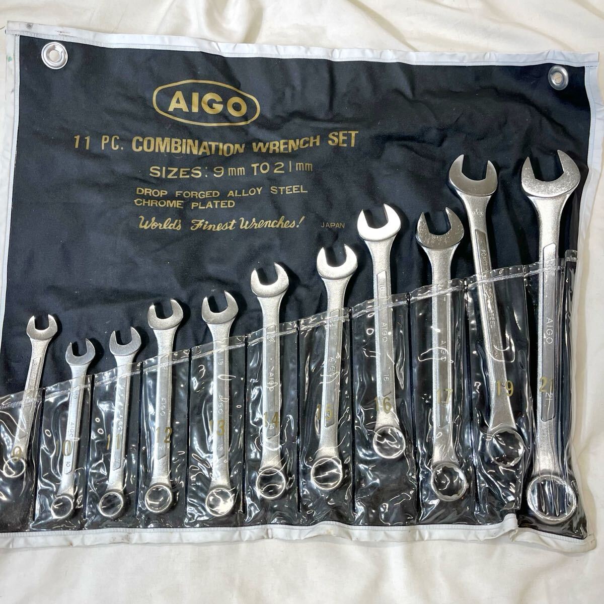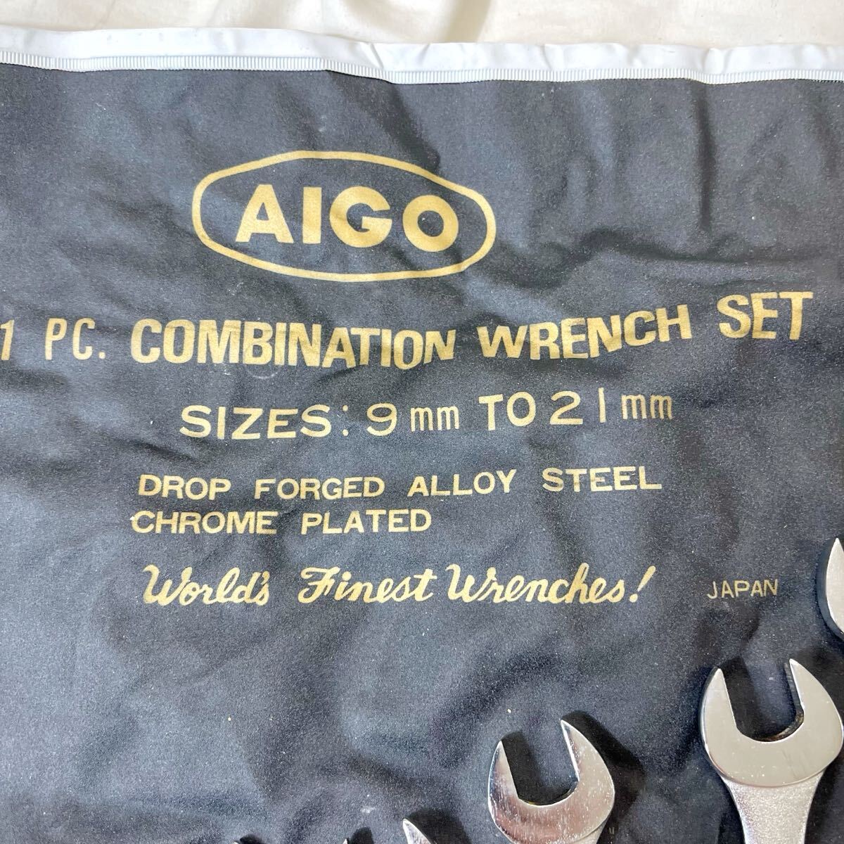 AIGO コンビネーションレンチ 11本セット。片側スパナ/片側メガネの両口タイプで、持ち運びに便利なロールポーチ付き。ポーチ表記に “DROP FORGED ALLOY STEEL / CHROME PLATED / JAPAN” の記載あり。