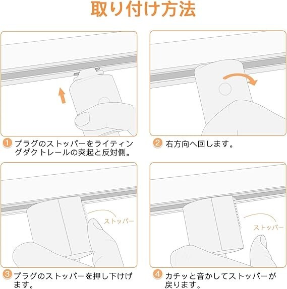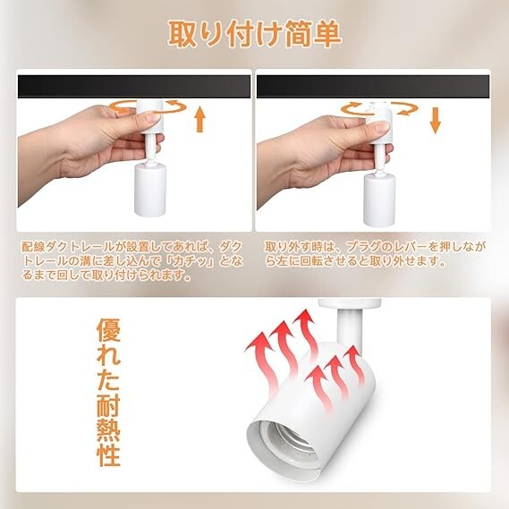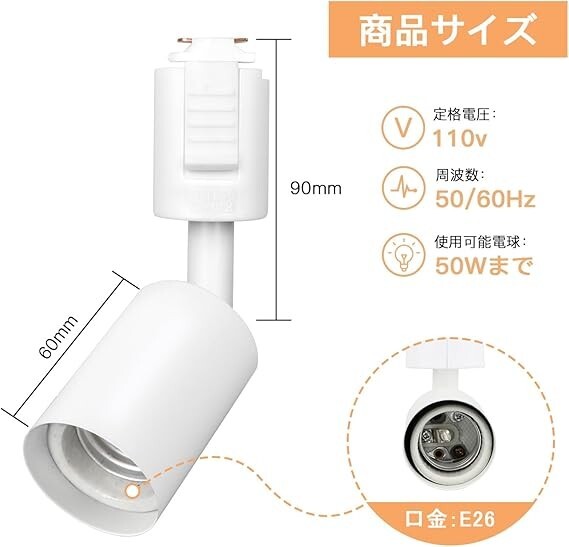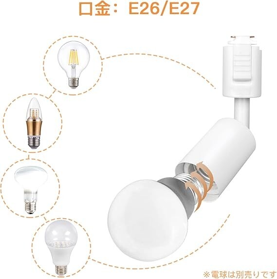 【取り付け簡単なスポットライト】これはライティングダクト専用の照明器具です。配線ダクトレールが設置してあれば、ダクトレールの溝に差し込んで回すだけで、複雑な配線作業が不要です。簡単に取り付けられます。小さいなサイズで、配線ダクトレールやライティングレールの上に自由に配置することができます。電気資格なしの素人やひとり暮らしの女性でも簡単に操作可能です。電球交換も簡単で、白熱電球、蛍光灯電球、LED電球など用途に合わせてお使いいただけます。(ご注意:電球は付属しておりません。) 【照射角度調節可能】上下に90度、約350度の角度で回転させることができます。用途に合わせて照明器具の角度を調整し、指定した位置に光を向けることが可能になります。 【製品仕様】本製品はPSE認証を受けており、品質が保証されています。製品仕様:パッケージ数量:2個セット 口金:E26 カラー:ホワイト 材?:?+PC+ABS+陶器製ランプヘッド 定格電圧:AC100~125V 定格電流:6A 使用可能電球:50w 質量100g以下の電球をご使用ください。 【幅広い用途に対応】映画館、美術館、一般家庭の照明、レストラン、キャビネット、会社、店舗、図書館、舞台照明、展示ホールなど、様々なシーンで活躍しています。スポットライトのように、壁や絵などを照らし、雰囲気ある空間を演出します。また、ダイニングテーブルの上の照明としてもぴったりです。照明を変えて雰囲気を出したり、変えたりしたいときに最適です。 【一年保証】ご購入日より1年間の保証ををご提供致します。使用中、製品の使用について何か不明なところが御座いましたら、ご心配なさらないで注文履歴より弊店までご連絡ください。必ず最善を尽くし、保証サービスにご対応いたします。