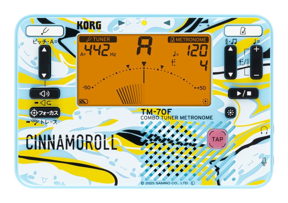 | 正確なチューニングと楽しいデザインで、練習をもっと快適に。 TM-70Cにサンリオキャラクターズコラボモデルが登場。 多彩な機能と高い視認性を備えたチューナー・メトロノームTM-70Fと、楽器に取り付けて振動を直接キャッチできるクリップ式コンタクト・マイクCM-400がセットになったTM-70Cに、ハローキティ、ポチャッコ、シナモロールのサンリオキャラクターズ特別デザインが登場!これまでのTMシリーズ×サンリオキャラクターズコラボに加え、コンタクト・マイクにもキャラクターデザインが施されるのは今回が初めて。カラフルで楽しいデザインが、練習の気分をぐっと盛り上げます。サンリオキャラクターズと一緒に、毎日の音楽ライフをもっと楽しく。 コンパクトなボディに機能満載。チューナーとメトロノームが一体化したTMシリーズに、待望のニュー・モデル、TM-70F登場。 チューナーとメトロノームを同時に使用でき、多彩な機能と抜群の視認性を誇るTMシリーズは、管・弦楽器のチューニング及びリズム・トレーニング用アイテムとしてベストセラーを続けています。最新モデルのTM-70Fは、さらにボディの小型化に成功。ポケットにも収まるサイズながら、視認性のアップしたディスプレイ、よりチューニングの精度をアップするフォーカス・モードも新たに搭載し、使い勝手も向上しています。メトロノームやサウンドアウトの音質もパワーアップし、周りの音に埋もれることはありません。また、演奏の基本となるチューニングだからこそ品質も強化し、TM-70から生産地を日本へと変更しました。この“メイド・イン・ジャパン”の称号は、長年に渡り、コルグがチューナー/メトロノーム・シーンを牽引してきたというプライドと品質へのこだわりの証とも言えるのです。 ・チューニング機能とメトロノーム機能を同時に使用可能 ・幅広い楽器に対応するC1~C8のワイドな測定範囲 ・感度、視認性ともに良好な液晶針式メーター採用 ・よりチューニングの精度をアップするフォーカス・モード/トレース・モード ・TM-60から小型化しつつディスプレイの表記や表示方法を改善、視認性が向上 ・音の明瞭度がさらにアップしたメトロノーム/サウンドアウト/サウンドバック機能 ・様々なコンサート・ピッチに対応するキャリブレーション機能 ・純正な長/短3度の音程を示すマーク付き ・耳でのチューニングを身に付けられるサウンドアウト・モードとサウンドバック・モードを搭載 ・30~252回/分のワイドなテンポ範囲を持つメトロノーム。3タイプのテンポ設定、15種のリズム・バリエーションを搭載 ・電池寿命最大250時間のロングライフ設計 ・便利なメモリー・バックアップ機能、オート・パワー・オフ機能 ・本体を自立できる折りたたみ式スタンド付き ・各機能をアイコンで表示するユニバーサル・デザインを採用 ・コンタクト・マイクCM-400を使用して、より精度の高いチューニングが可能 よりコンパクトに、より使いやすくなったTM-70F チューナーとメトロノームが一体化したTMシリーズは、長年培ってきたコルグの技術の粋を集めたチューナー/メトロノームの決定版。前モデルのTM-60よりも一回り小型化しつつ、ディスプレイ部の音名・音階表示は大きくなりました。さらに液晶の視認性も向上したことで、様々な角度からも見やすくなり、ストレス無く精度の高いチューニングをサポートします。 管・弦楽器の音程をスピーディーに、正確に検出するチューナー部 C1~C8のワイドな測定範囲とレスポンス良好な液晶針式メーター 管・弦楽器を中心に様々な楽器の音名・音域測定が可能。C1(32.70Hz)~C8(4186.01Hz)の測定範囲で、低音楽器、倍音が多く音を拾いにくい楽器、さらにギター、ウクレレなどのアコースティック楽器のチューニングも簡単かつ正確に行えます。コンタクト・マイクCM-400を使用すれば、振動を直接チューナーに送ることができ、周囲に左右されない、確実なチューニングを行えます。また、コルグ独自の技術により、タイムラグなしで正確に音程を検出する液晶針式メーターは、管楽器の場合にロングトーンで生じやすい“音の揺れ”もきちんとチェックでき、ブレのない、安定した発音を身につけることができます。 よりチューニングの精度をアップするフォーカス・モード/トレース・モード 通常モードでは、±50セント内の表示画面ですが、フォーカス・モードでは、±25セントに拡大した表示画面になります。長短三度など、よりシビアなチューニングに対応し、練習を一段階レベルアップできます。また、過去2秒間に検出したピッチ範囲をメーターの下段に表示するトレース・モードも搭載。ロングトーンの安定感を確認するときに活用すると便利です。 純正な長/短3度の音程を示すマーク付き ブラス・バンドやオーケストラで合奏を行うとき、特にハーモニーのずれを感じやすい3度和音も、長3度と短3度のピッチを平均律から少しずらすことにより、耳に心地よい響きを得ることができ