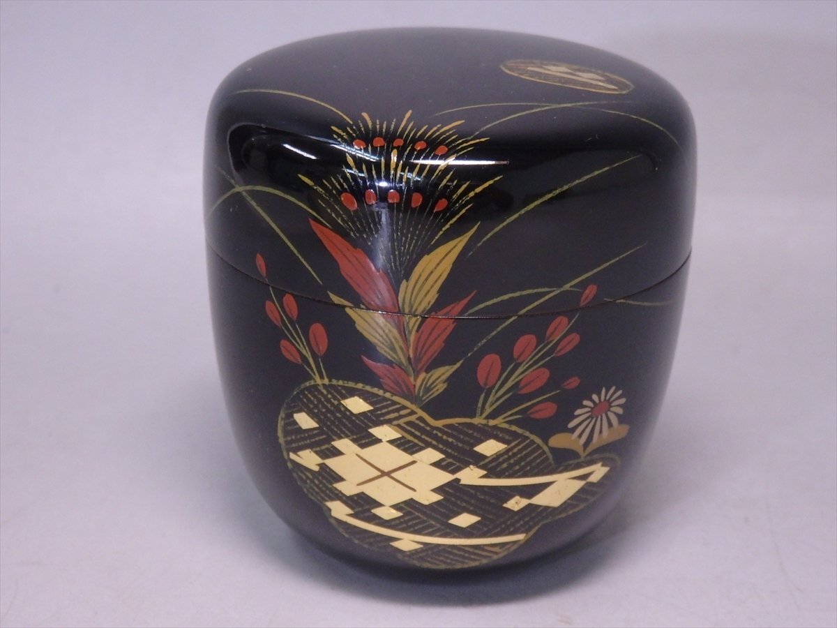 【管理番号5-0910114-6 スタッフコメント:iy】  ☆ハギやススキなどの秋の草、金箔で大内菱をあしらった優美な絵模様が特徴です。お手入れのラクな樹脂製。棗はキレイです。木箱はシミが多いです。