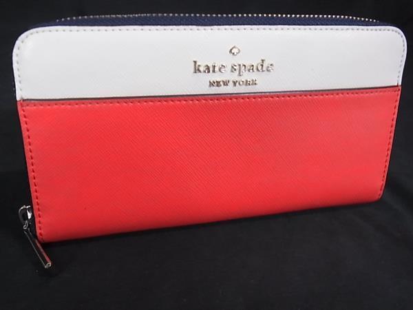 ■美品■ kate spade ケイトスペード レザー ラウンドファスナー 長財布 ウォレット 札入れ 小銭入れ レッド系×アイボリー系 DJ9864