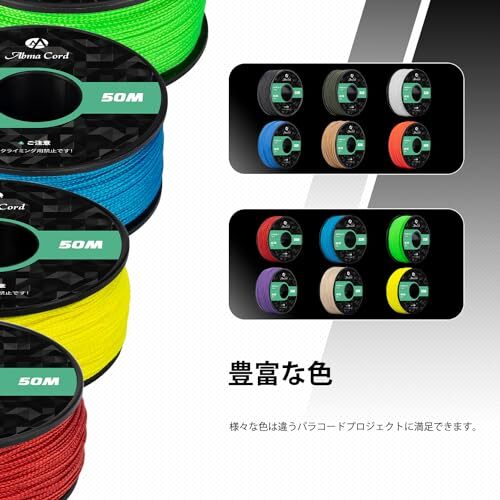 【サイズと色】スプールに巻かれる約50Mの長さ、直径は約1.18mm、コードがバラつかず使いやすいです。またさまざまな色がパラコードプロジェクトに役に立ちます。
