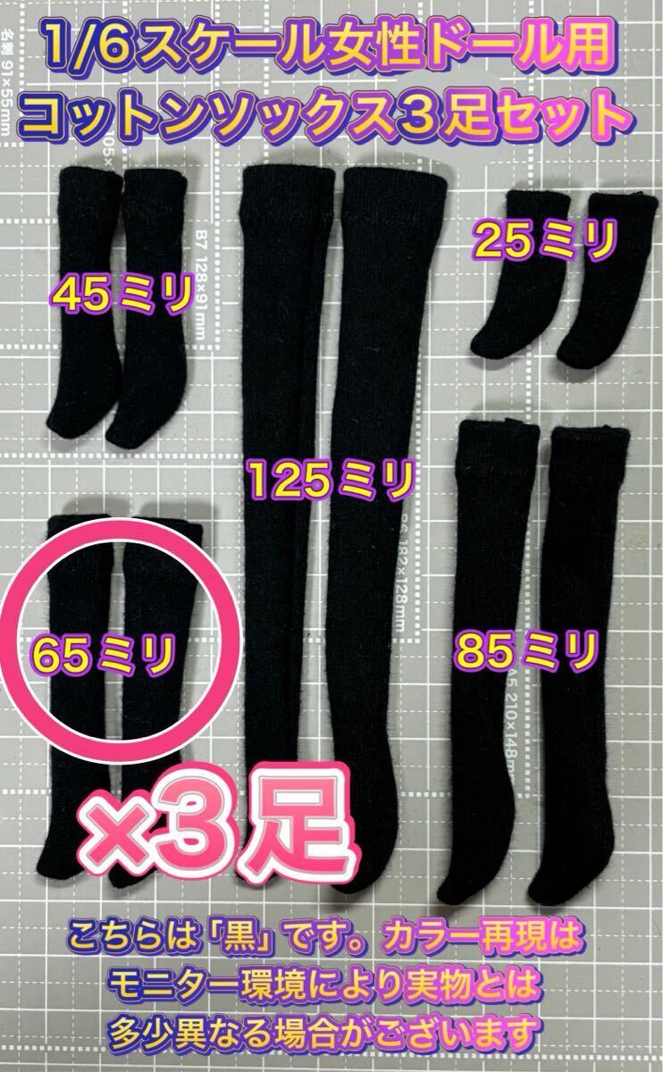リカちゃん、ジェニー、ネオブライス、アイシードール 、オビツ27女性ボディ、ハッシュタグボディなどが着用出来る、ごくシンプルな綿のソックス長さ違い、平置きで約65ミリの3足セットです。