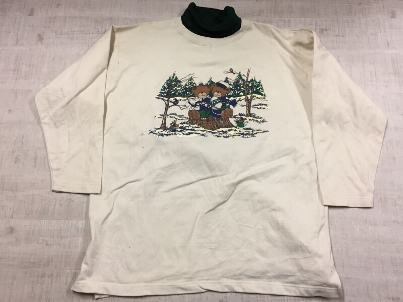 CHIC オールド レトロ ファンシー古着 90s テディーベア くまさん 雪景色 スウェットトレーナー レディース レイヤード モックネック 2X 白