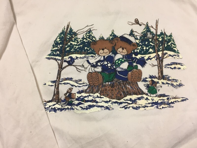 CHIC オールド レトロ ファンシー古着 90s テディーベア くまさん 雪景色 スウェットトレーナー レディース レイヤード モックネック 2X 白 です。