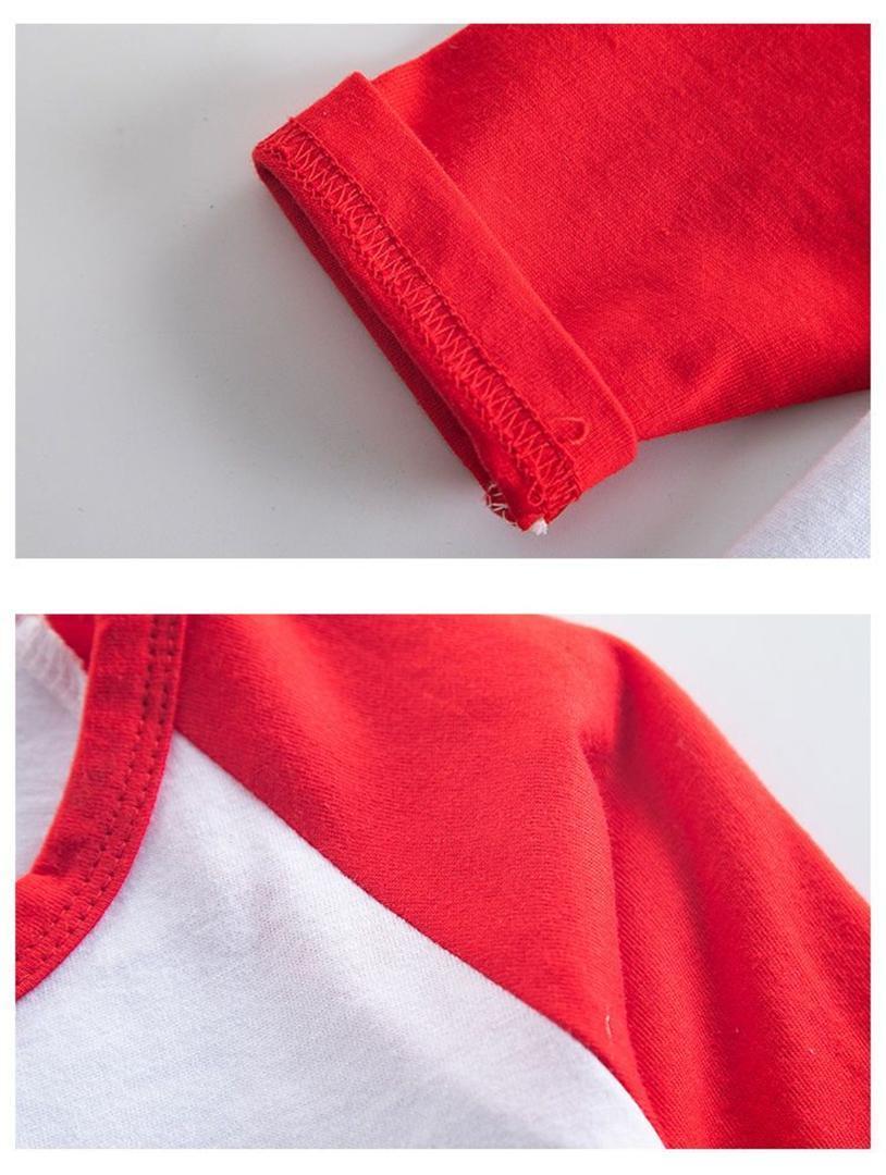 動きやすいラグラン袖で、活発なお子様の動きを妨げません。赤と白のコントラストがスタイリッシュ。