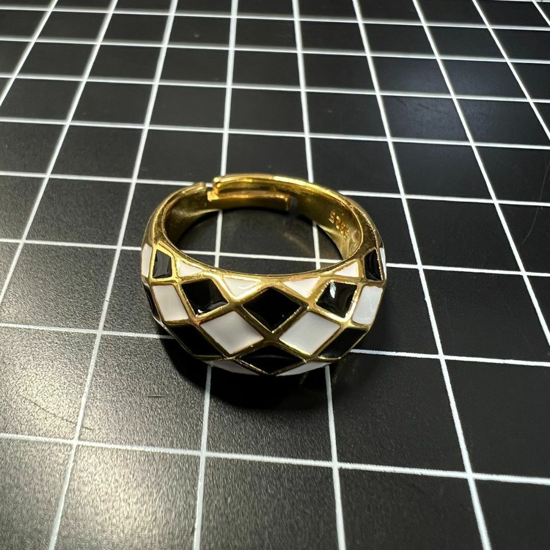 A696 匿名配送 指輪 レディース メンズ チェッカーフラッグリング ゴールド s925 フリーサイズ サイズ調節可能 カジュアル 太め