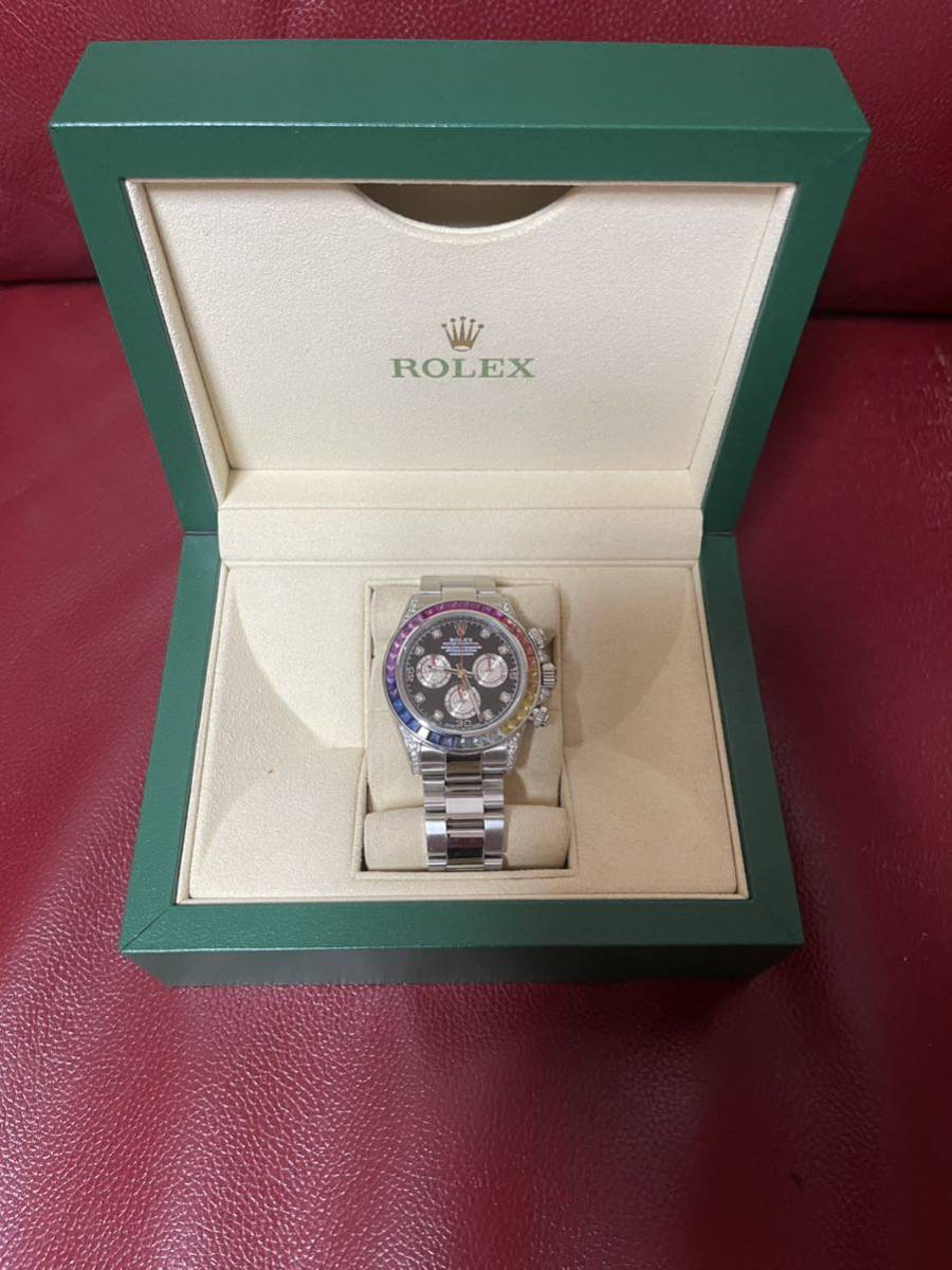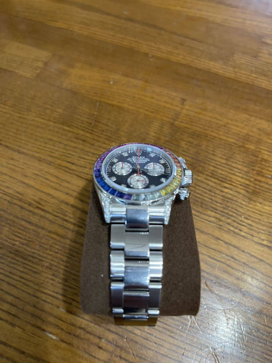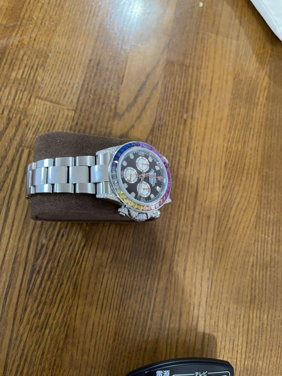カッコ良く目立ちます!ダイヤモンドももちろん綺麗です!12コマあり長いです。プラス新品1コマあります。リセールも抜群です!ref116520(116599RBOW仕様)レインボーカスタム!!機械も絶好調!宜しくお願い致します。40㎜ステンレススチール ダイヤモンドカスタム風防:サファイアクリスタルガラスケース厚:12.5mm自動巻き Cal.4130 パワーリザーブ約72時間 文字盤:ブラック スモールカウンター仕様:クロノグラフ 防水性:100M防水ストラップ:ステンレススチール 腕回り約18.5cm、長いです。付属品:内箱付き某有名店から購入!年式:Z番摺り替え防止の為ノークレーム、ノーリターンのみでお願いします。違反申告をされてる方がいらっしゃいますが、正規品116520をレインボーにカスタムしてグレードアップした商品です。誤解なく宜しくお願いします。この個体はref116520正規品を(116599RBOW仕様)にカスタムしたものでダイヤ等ももちろん天然ダイヤモンドです。