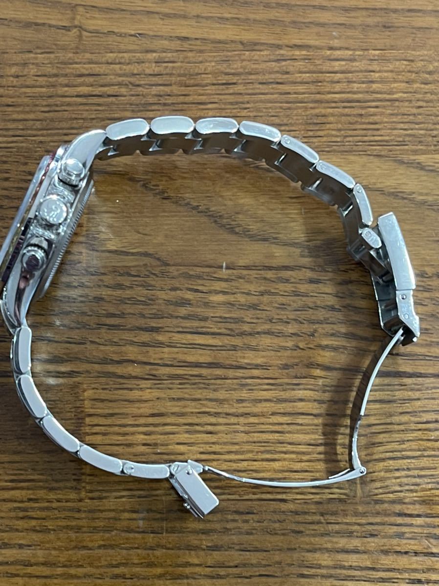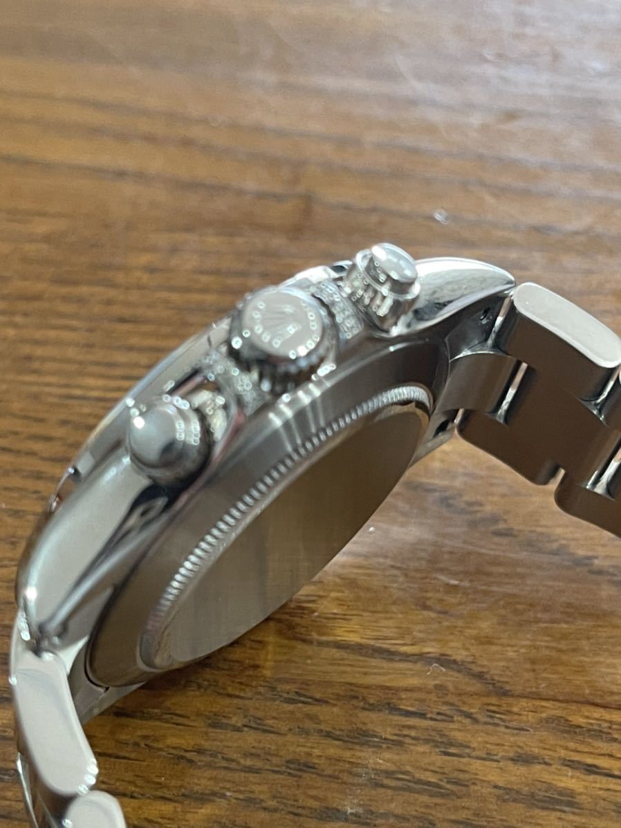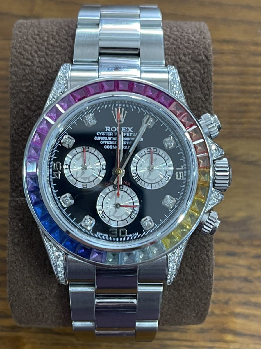 カッコ良く目立ちます!ダイヤモンドももちろん綺麗です!12コマあり長いです。プラス新品1コマあります。リセールも抜群です!ref116520(116599RBOW仕様)レインボーカスタム!!機械も絶好調!宜しくお願い致します。40㎜ステンレススチール ダイヤモンドカスタム風防:サファイアクリスタルガラスケース厚:12.5mm自動巻き Cal.4130 パワーリザーブ約72時間 文字盤:ブラック スモールカウンター仕様:クロノグラフ 防水性:100M防水ストラップ:ステンレススチール 腕回り約18.5cm、長いです。付属品:内箱付き某有名店から購入!年式:Z番摺り替え防止の為ノークレーム、ノーリターンのみでお願いします。違反申告をされてる方がいらっしゃいますが、正規品116520をレインボーにカスタムしてグレードアップした商品です。誤解なく宜しくお願いします。この個体はref116520正規品を(116599RBOW仕様)にカスタムしたものでダイヤ等ももちろん天然ダイヤモンドです。