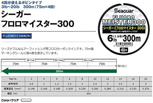 「シーガー(Seaguar) シーガー フロロマイスター300 10lb(2.5号) 300m クリア」▼4562398224131▼(商品説明)300m・クリア 10lb FLM302.5・・Size:10lb・素材: フロロカーボン・号数:2号 / 全長:300m / 強度:10lb / カラー:クリア・主な対象魚: ブラックバス「4回」使えるボビンタイプ。リーズナブルなルアーフィッシング用フロロカーボンラインです。75m毎にマーキングシールに残メートル数を表示しています。
