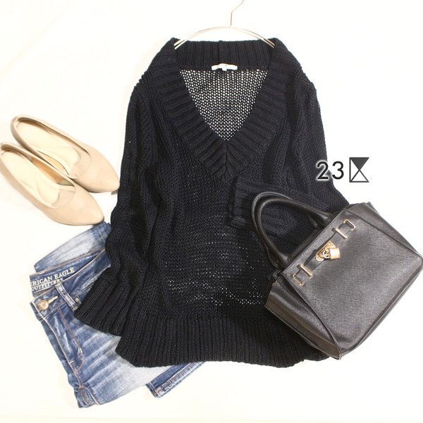 美品 オンワード樫山 23区 大きいサイズ 44号 リネン100% ざっくり編み 厚手ニット セーター 2XL 春 秋 合服 25A09