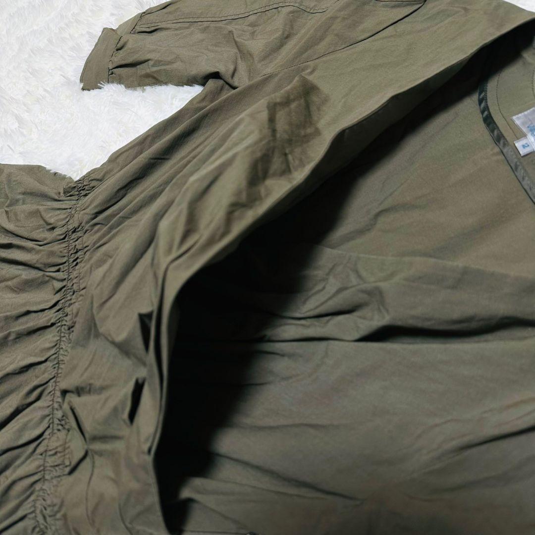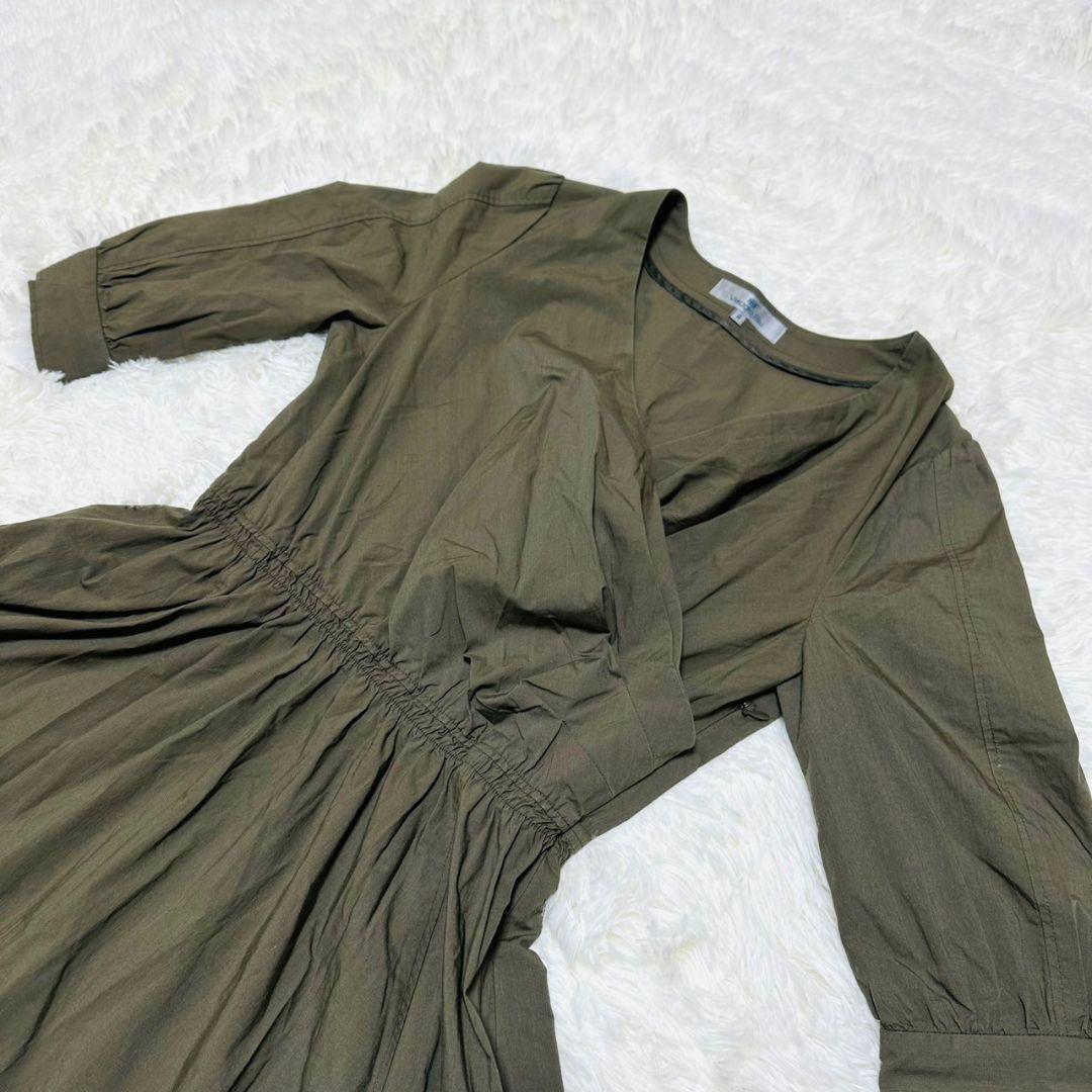 オリーブ色のAラインワンピース、3/4袖、コットン混紡素材。