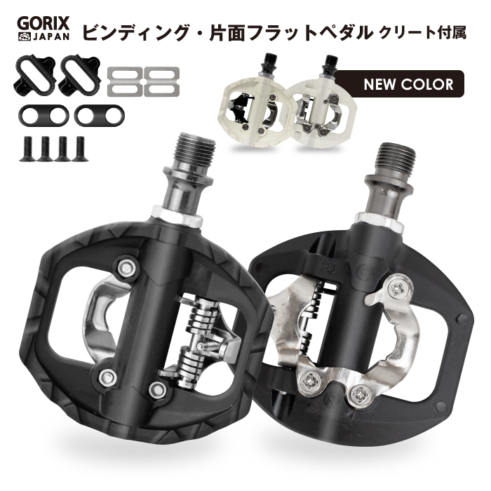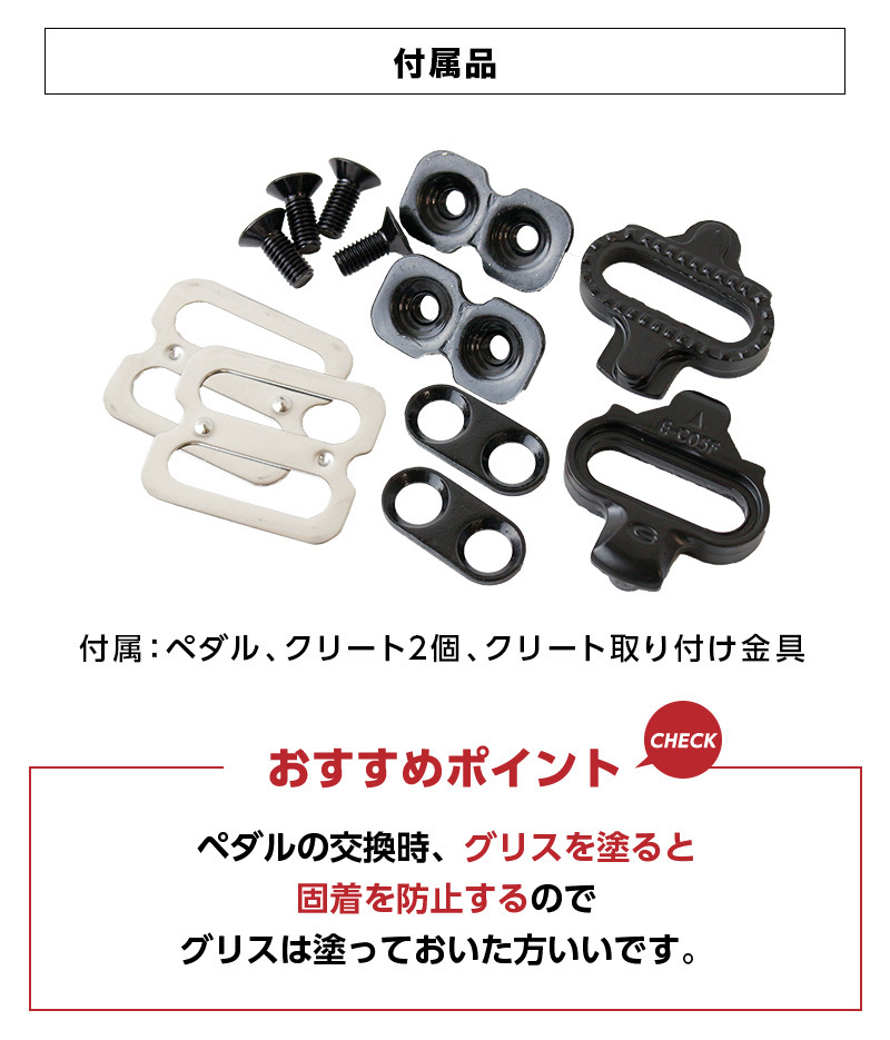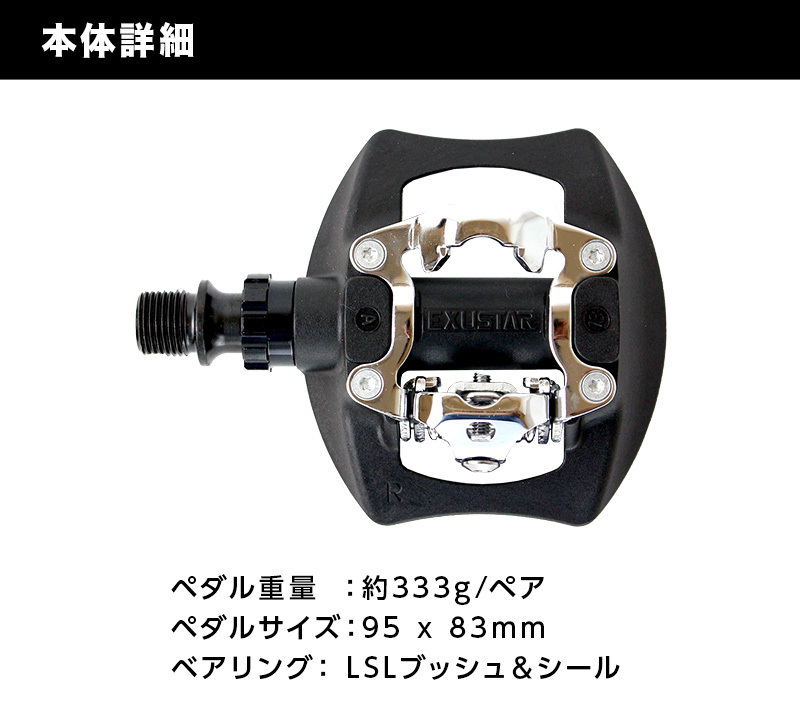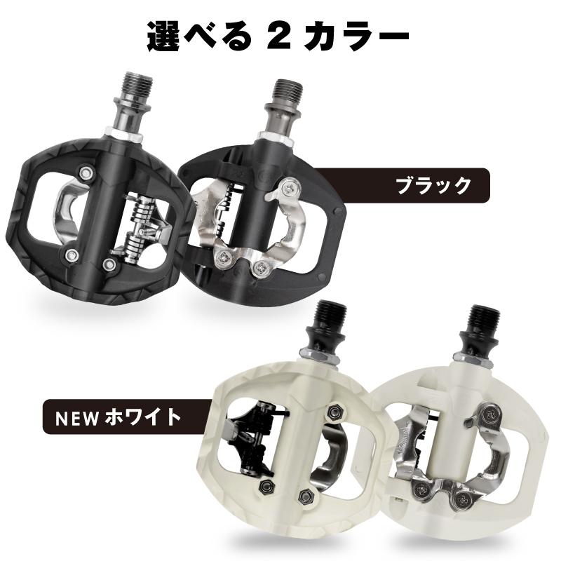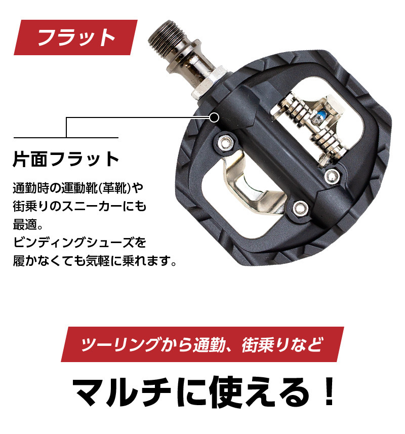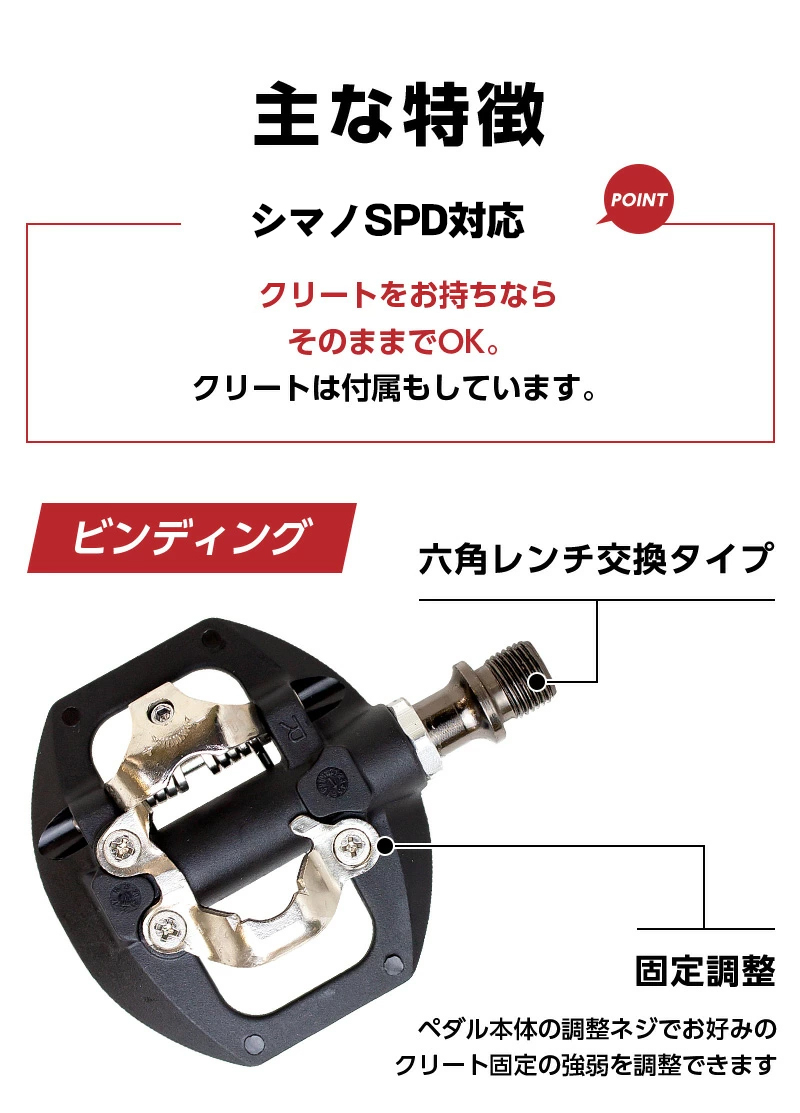 | ロードバイクやクロスバイク、MTBに最適なマルチペダル。 シマノSPD対応 片面フラット 片面ビンディングペダル ペダル本体の調整ネジを調整することで、クリートを固定する強さを設定できます。 片側がフラットなので、通勤時や街乗りのスニーカーや、ちょっとそこまで行くのに便利です。 ・ビンディング面は固定調整付きで脱着の強さ調整ができます。 ・六角レンチペダル交換タイプです。 ・(おすすめ)ペダルの交換時にグリスを塗ると固着を防止するのでグリスは塗っておく事をおすすめします。 付属:ペダル、クリート2個、クリート取り付け金具 サイズ(約): 95 X 83mm 重量(約): 333g(ペア) ベアリング: LSLブッシュ&シール。 ※この商品は、 SHIMANO が製造、または販売するものではありません。 《ご注意》・商品は入荷によりキズがある場合があります。 ・保証対象外になりますのでご了承お願い致します。 ・ディスプレイ環境により実物と色が異なる場合が有ります。 ・入荷時期により予告無く一部仕様変更する場合が有ります。 ・サイズ表、注意事項は必ずご確認下さい。 | |