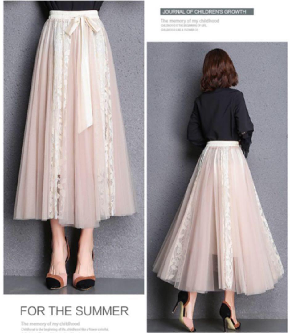 チュ-ルマキシ丈フレア-スカ-トです。前でリボンベルトを結ぶようになっています。生地が十分に使われていますのでエレガントで揺れ感も素敵です。!ウエストは総ゴムです。裏地有。ファスナ-なし。