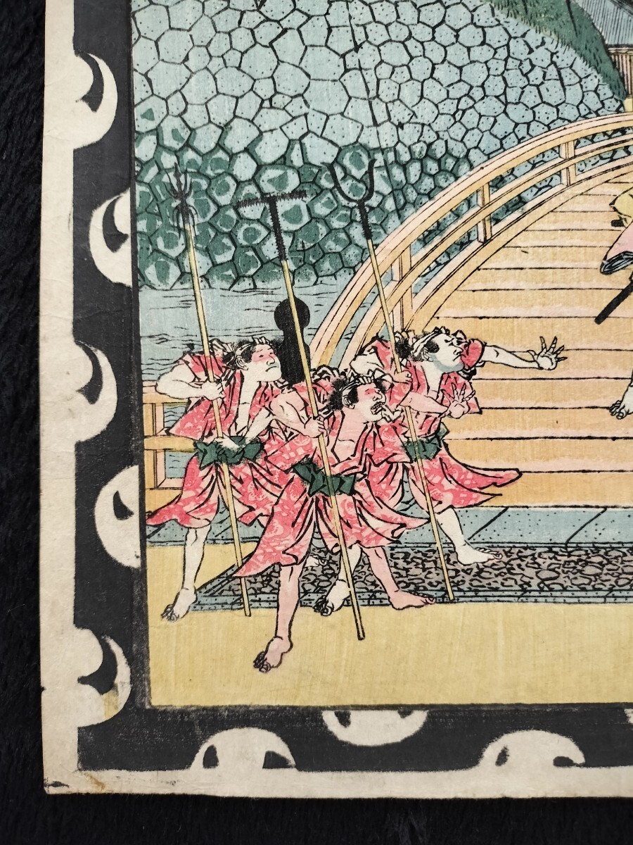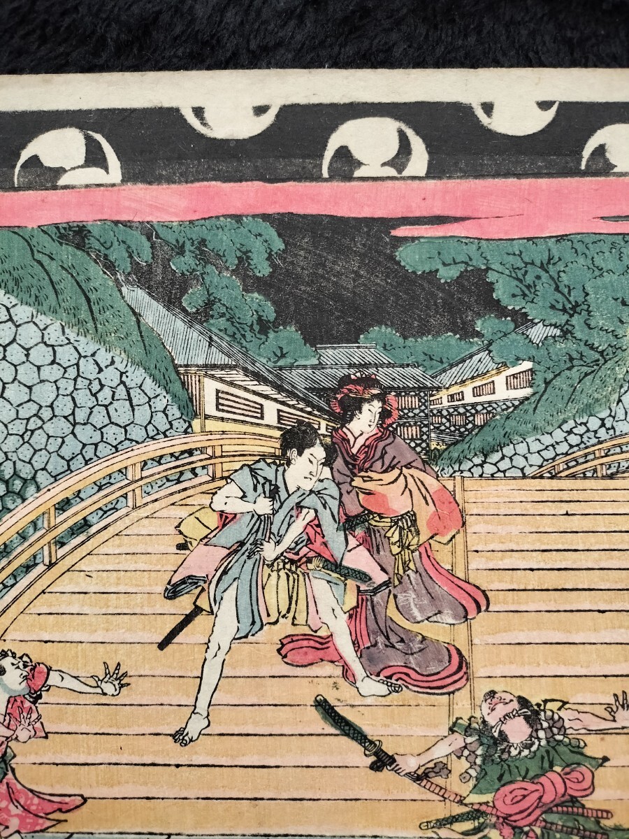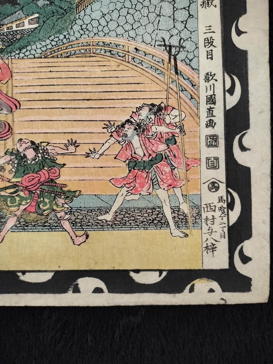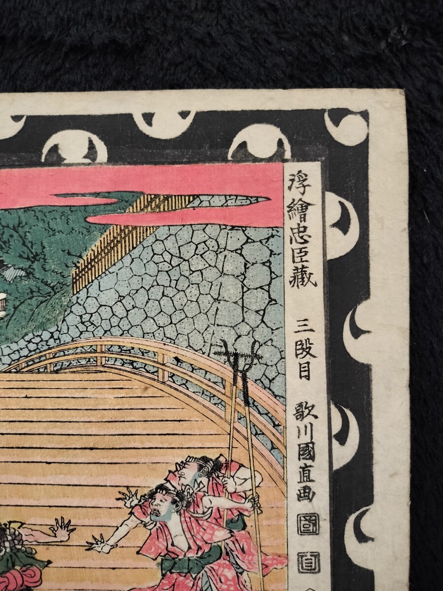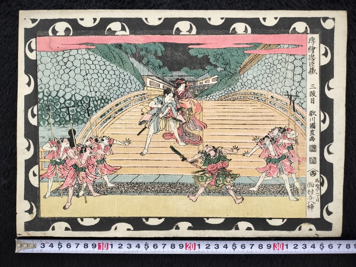 江戸期/真作 歌川国直「浮絵忠臣蔵 三段目」本物浮世絵木版画 武者絵 錦絵 大判 裏打ち