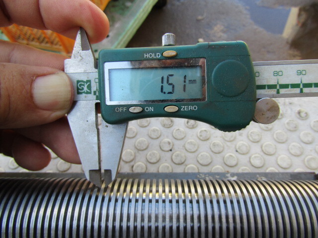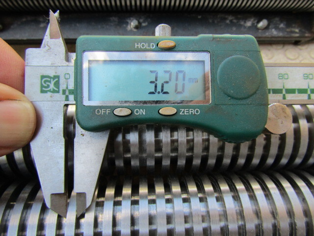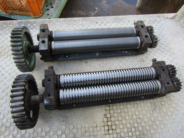 本体上部についているローラーの間隔は写真1枚目、中央上部右寄りのハンドルを回すと間隔が狭くなったり、広くなったりします。