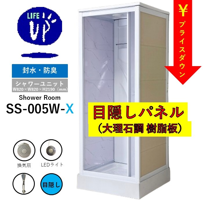 ・他社には無い、コンパクトサイズになっています。 ・据え置き型(組み立て式) ・シャワーユニット部分材質 アクリル ・樹脂(ポリスチレン)部分は、透明ではなく半透明樹脂(ポリスチレン)パネルを使用。(扉は内側スライド式)のため、ドアの開閉は左右どちらとも取り付け可能です。 ・カラーは上記写真でお確かめください。(写真の写りにより若干商品の色と異なる場合がございます。) ・ハンドシャワー ・LEDライト・換気扇 付き ※ルームライト・換気扇付属(別途ダクトの取り付けが必要になります) ・防水アース付きコンセント単相100V ・施工の際は必ず全ての接合部防水処理を行って下さい。 また電源コンセント、床などは必ず防水加工を施した場所に設置してください。 ・お湯、水の給水管・シャワーヘッド・シャワーホース・排水パイプはサービス品としてお付けします。(付属品を使用なさらない方は、お近くのホームセンターなどでも購入できます) ・取り付け本体図面、組立て説明書は御用意いたします。 ・2~4時間程度で設置可能(人員2名 コーキング作業を除く) ・給湯器等は施工業者様とご相談下さい。 ・2世帯住宅のセカンドバスルーム・エステサロン・スポーツジム等に最適です。 |