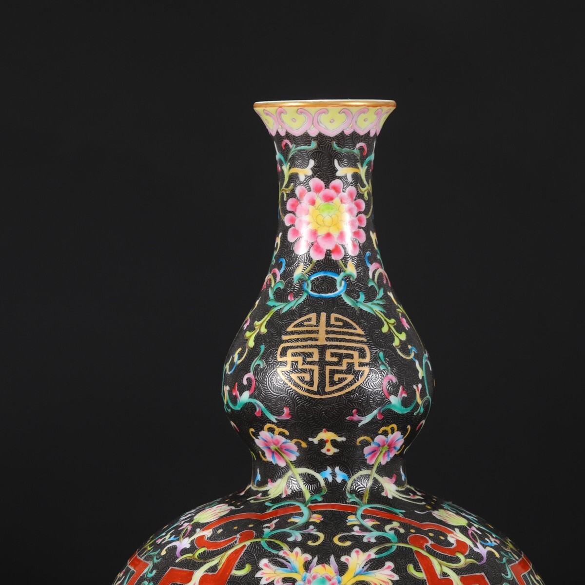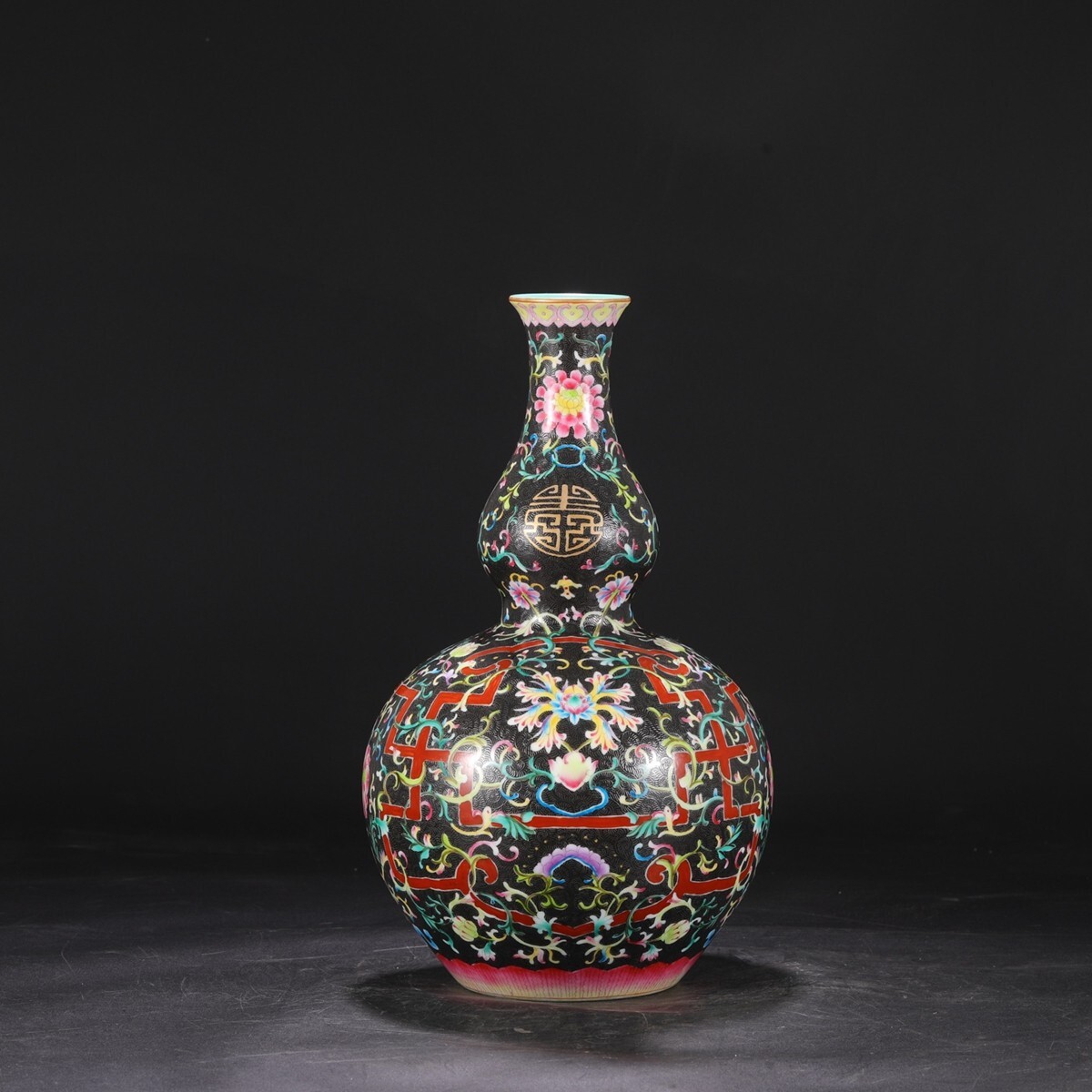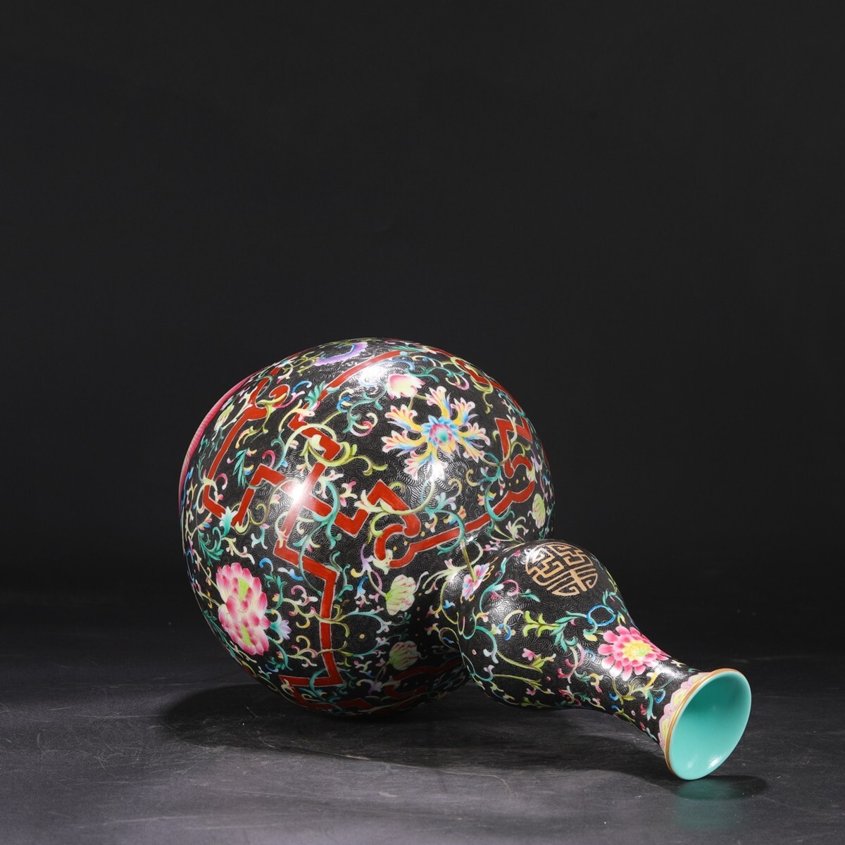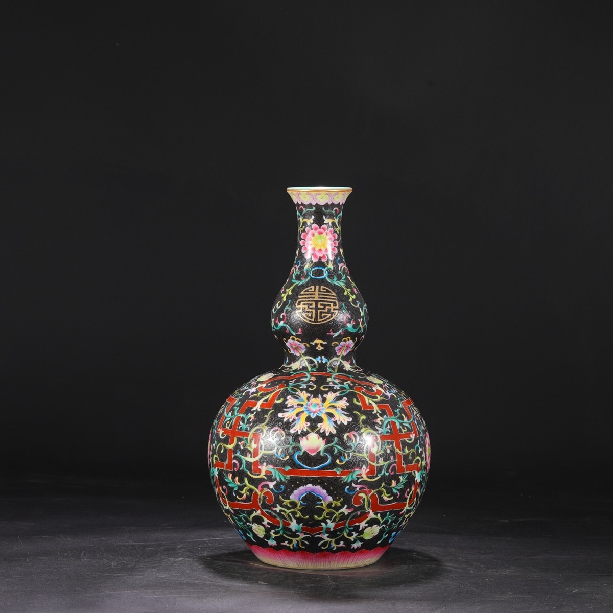 【瓏】陶磁器 琺瑯彩黒地纏枝花卉紋 大葫蘆瓶 大清乾隆年製 染付 置物擺件 古賞物 古美術 陶芸 蔵出