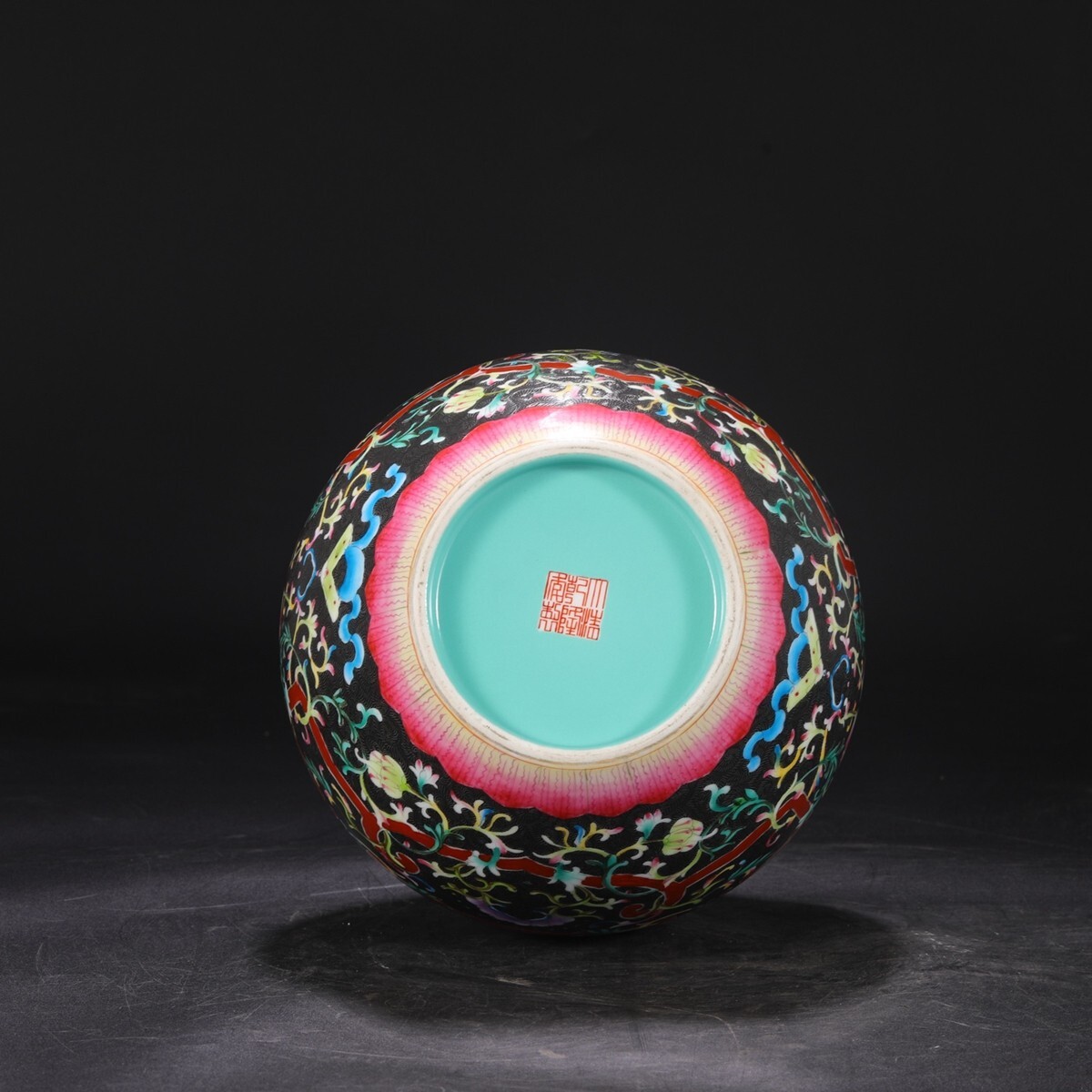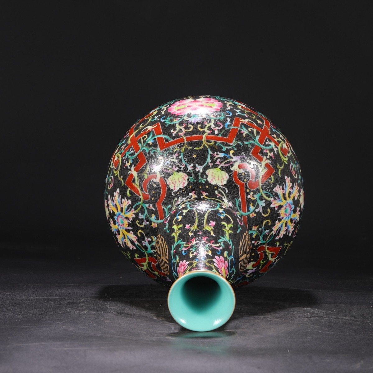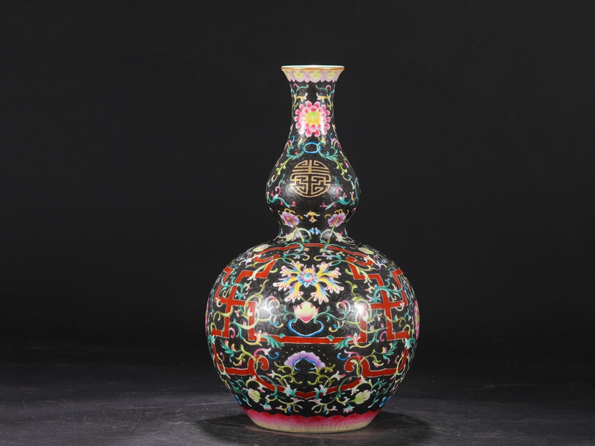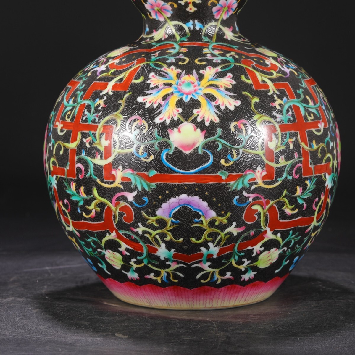 【瓏】陶磁器 琺瑯彩黒地纏枝花卉紋 大葫蘆瓶 大清乾隆年製 染付 置物擺件 古賞物 古美術 陶芸 蔵出
