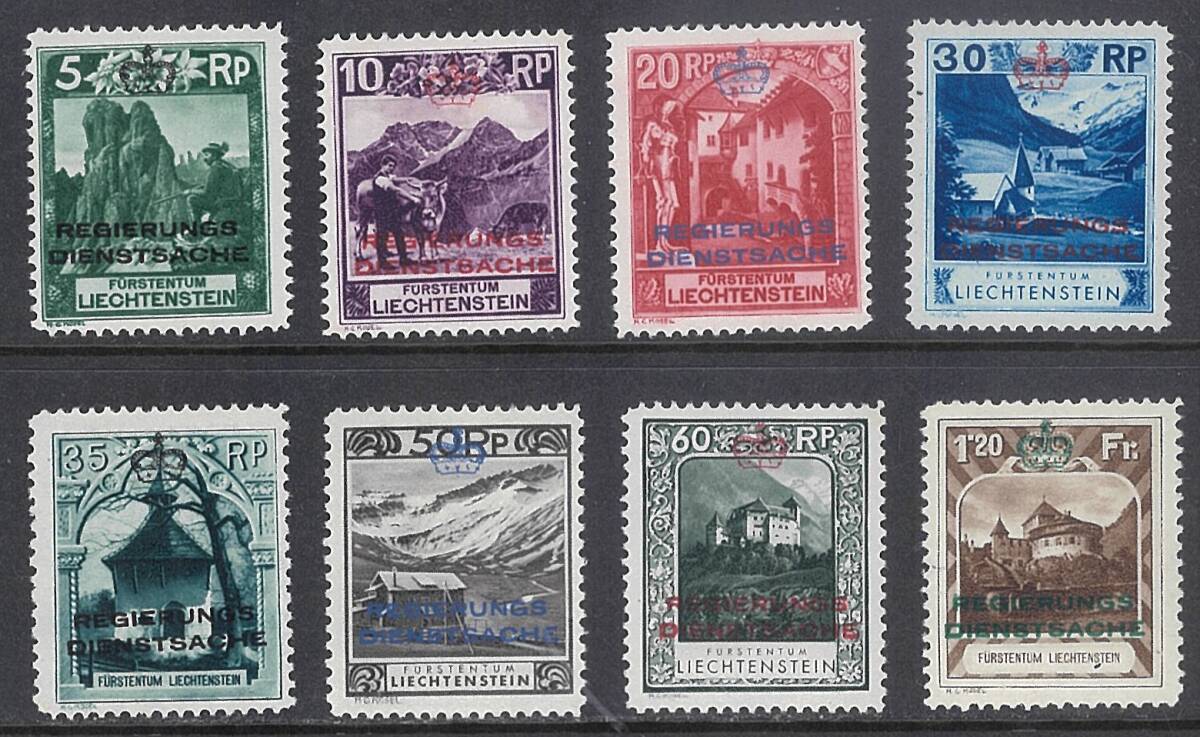 リヒテンシュタイン 1932年 #O1-8(OH) 公用加刷8完 / 礼拝堂 城 風景etc. / Cat.Val.$449.00-