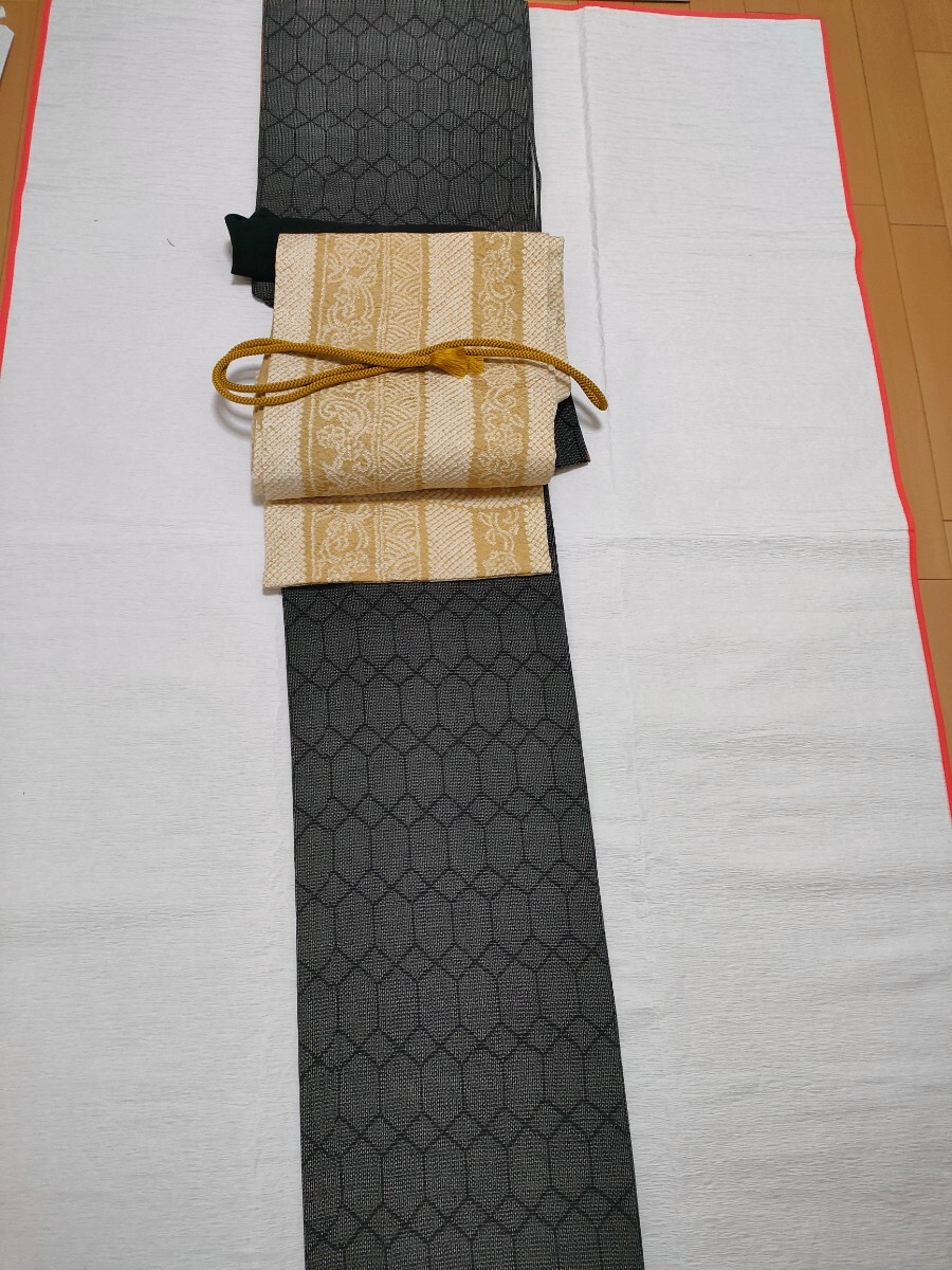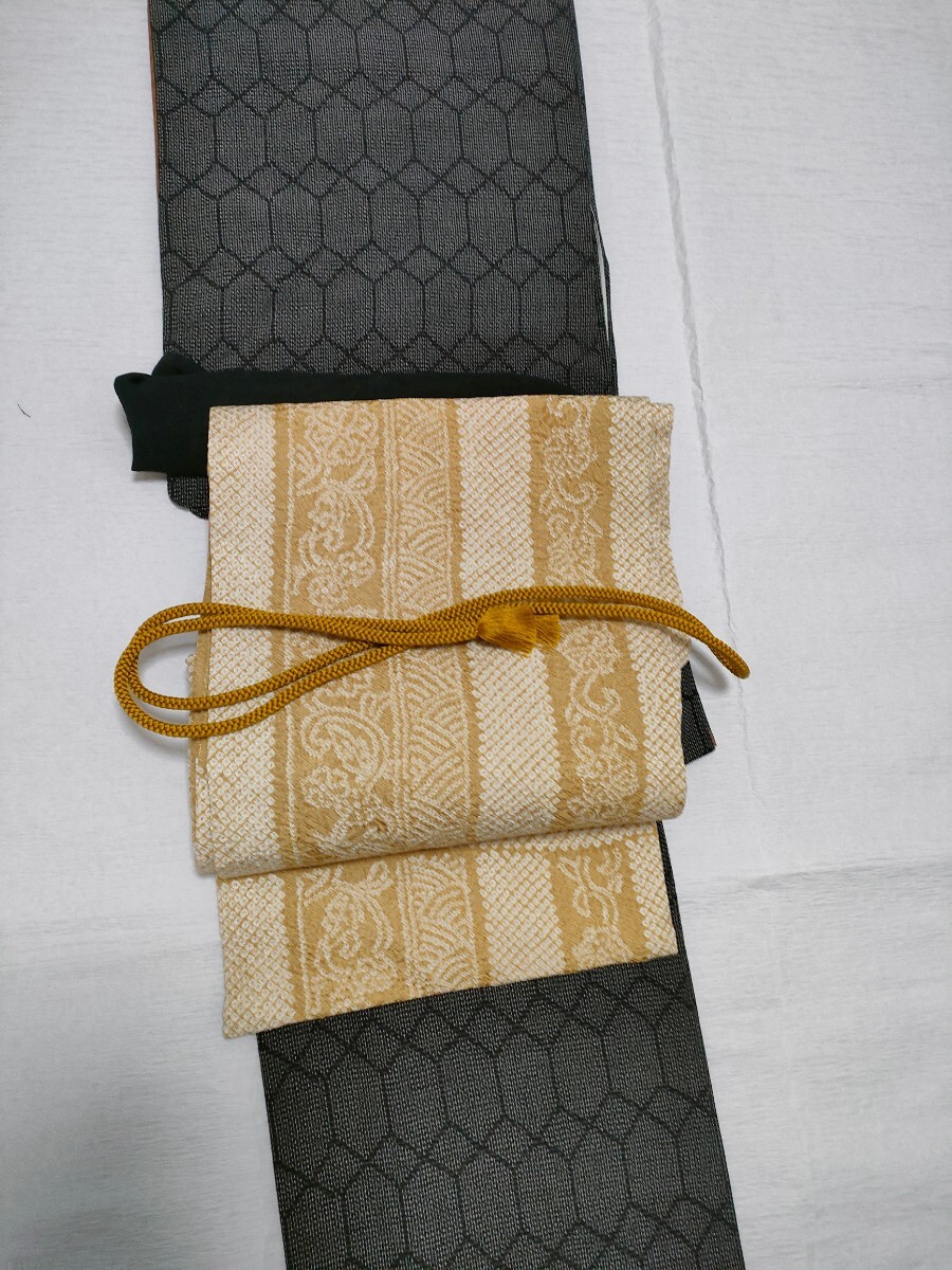 スッキリした黒白の亀甲柄、何を合わせても合いそうです。直線的な絞りの名古屋帯を合わせて大人シックな装いになりました。