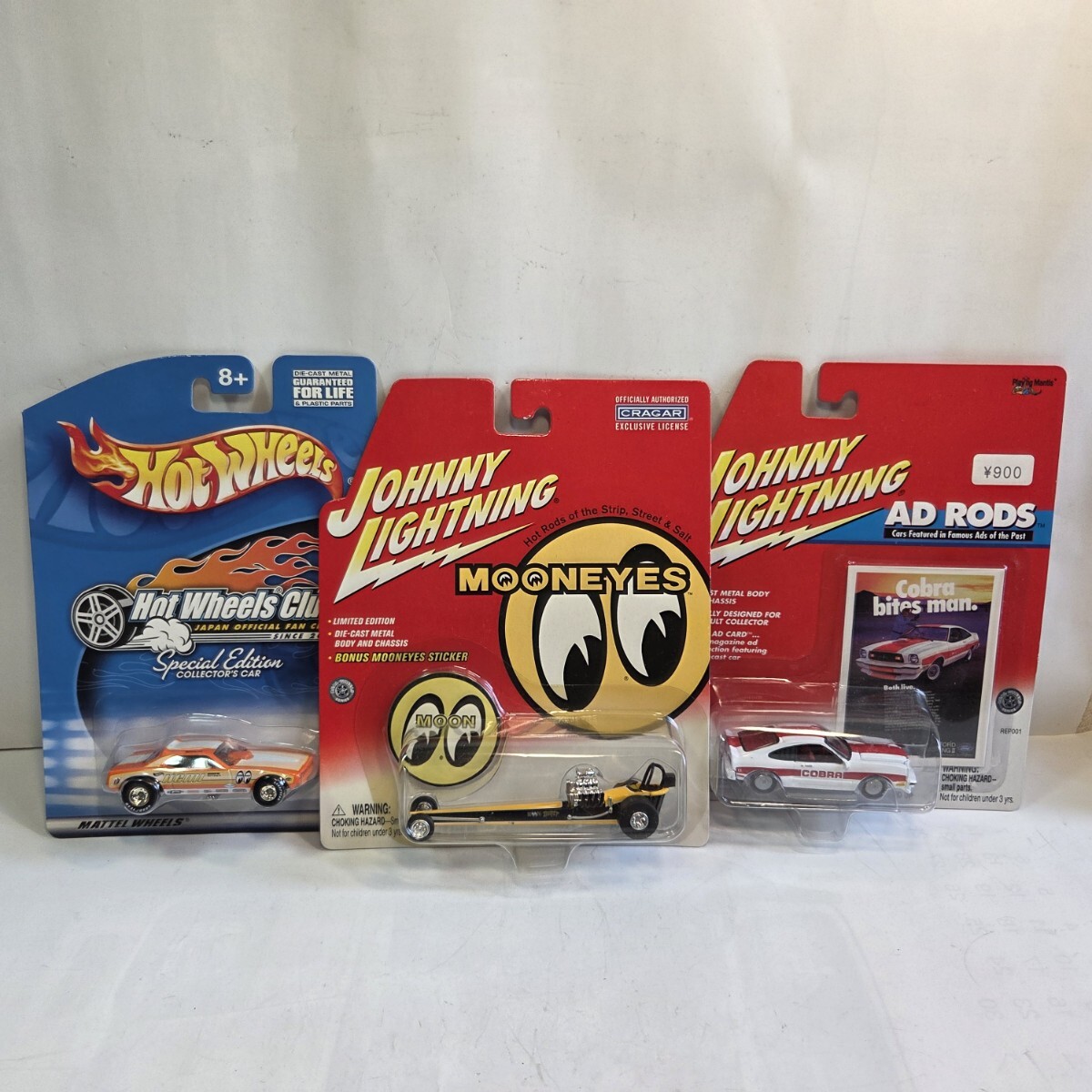 JOHNNY LIGHTNING 「COBRA カード付き」「MOON EYES DRAG STER ステッカー付き」Hotw heels「DODGE CHALLENGER ボディーが開く」3台セット 新品未使用 の出品です。