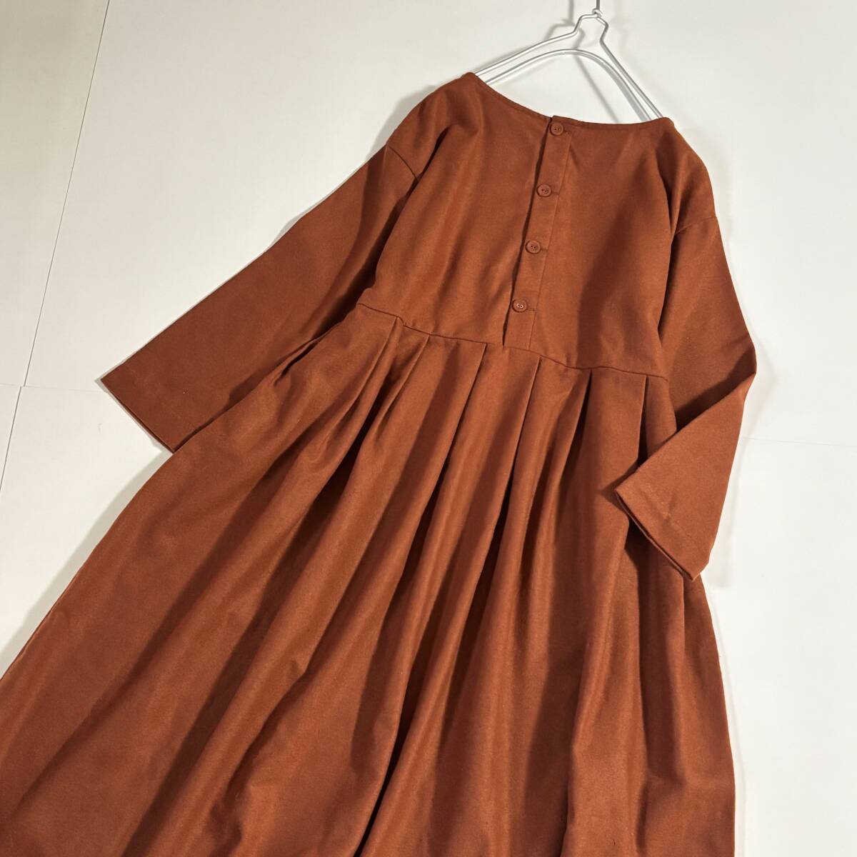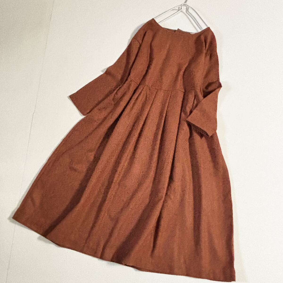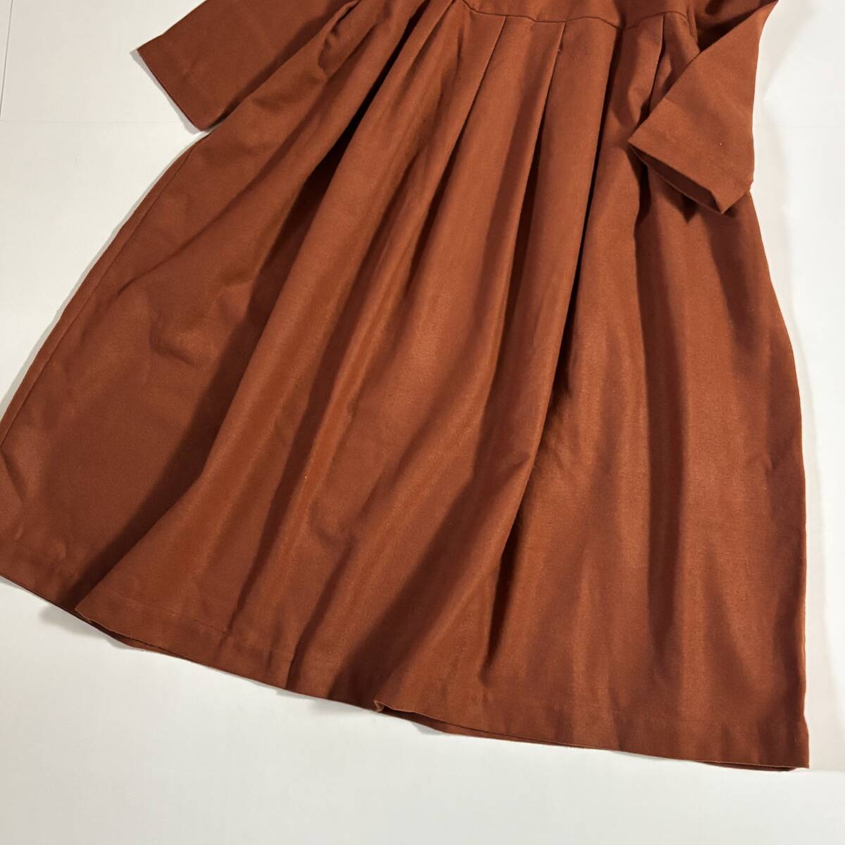 新 Samansa Mos2 サマンサモスモス ゆったりサイズF // ウールミックス 茶・オレンジ系 毛混起毛タック ワンピース ⑥