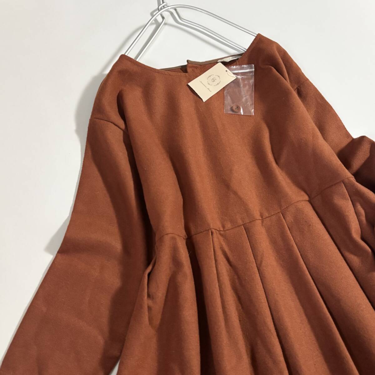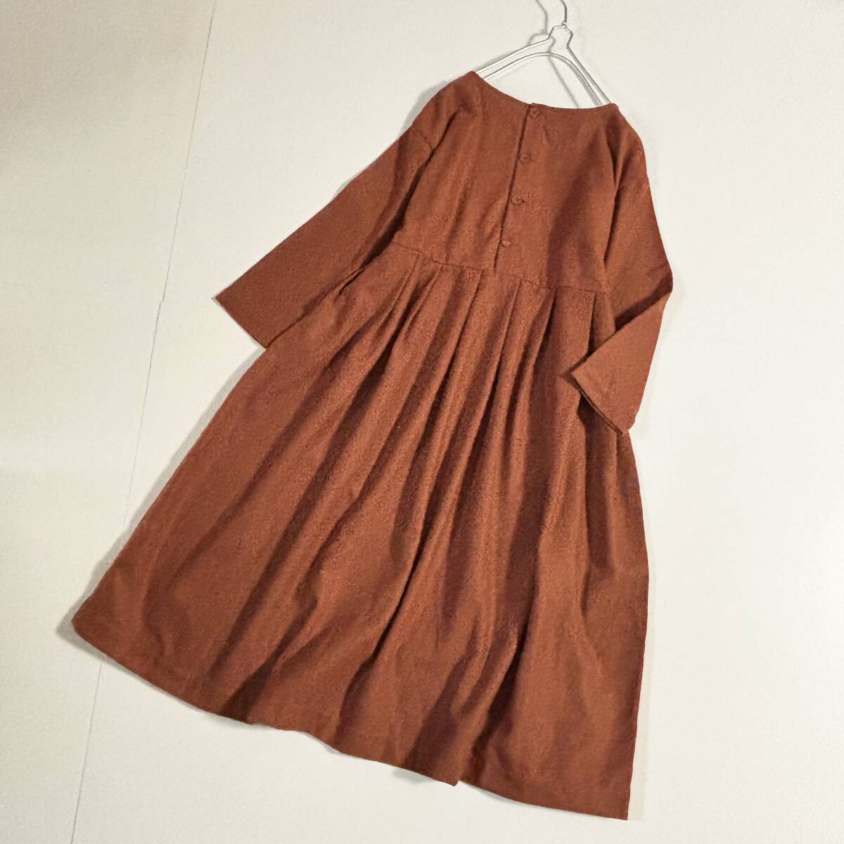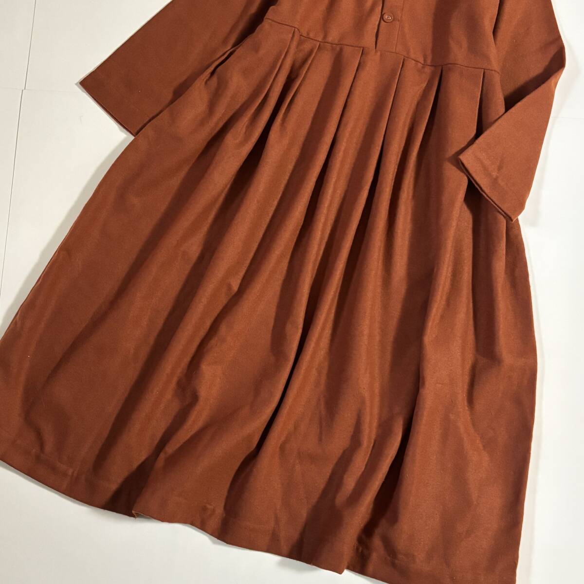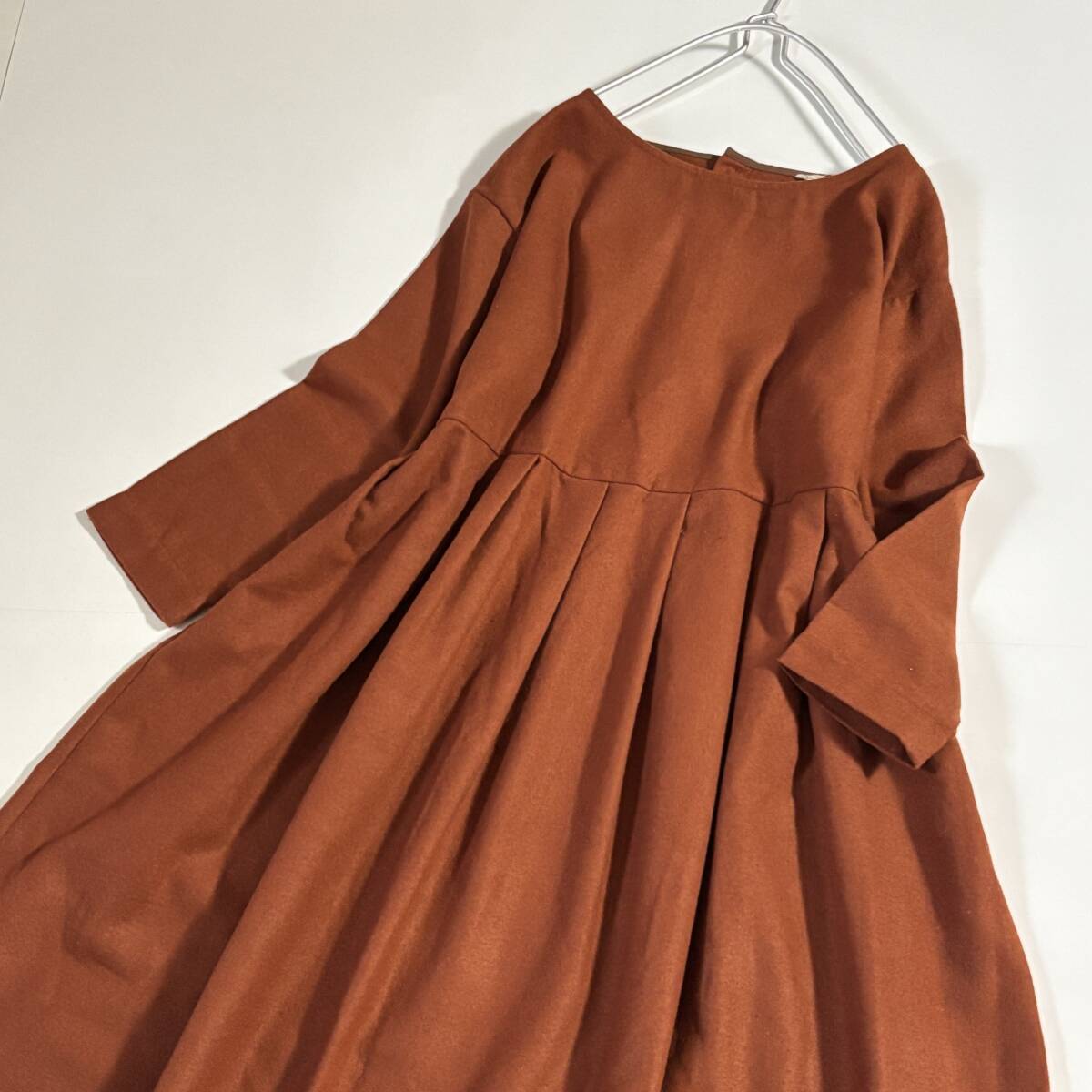 新 Samansa Mos2 サマンサモスモス ゆったりサイズF // ウールミックス 茶・オレンジ系 毛混起毛タック ワンピース ⑥