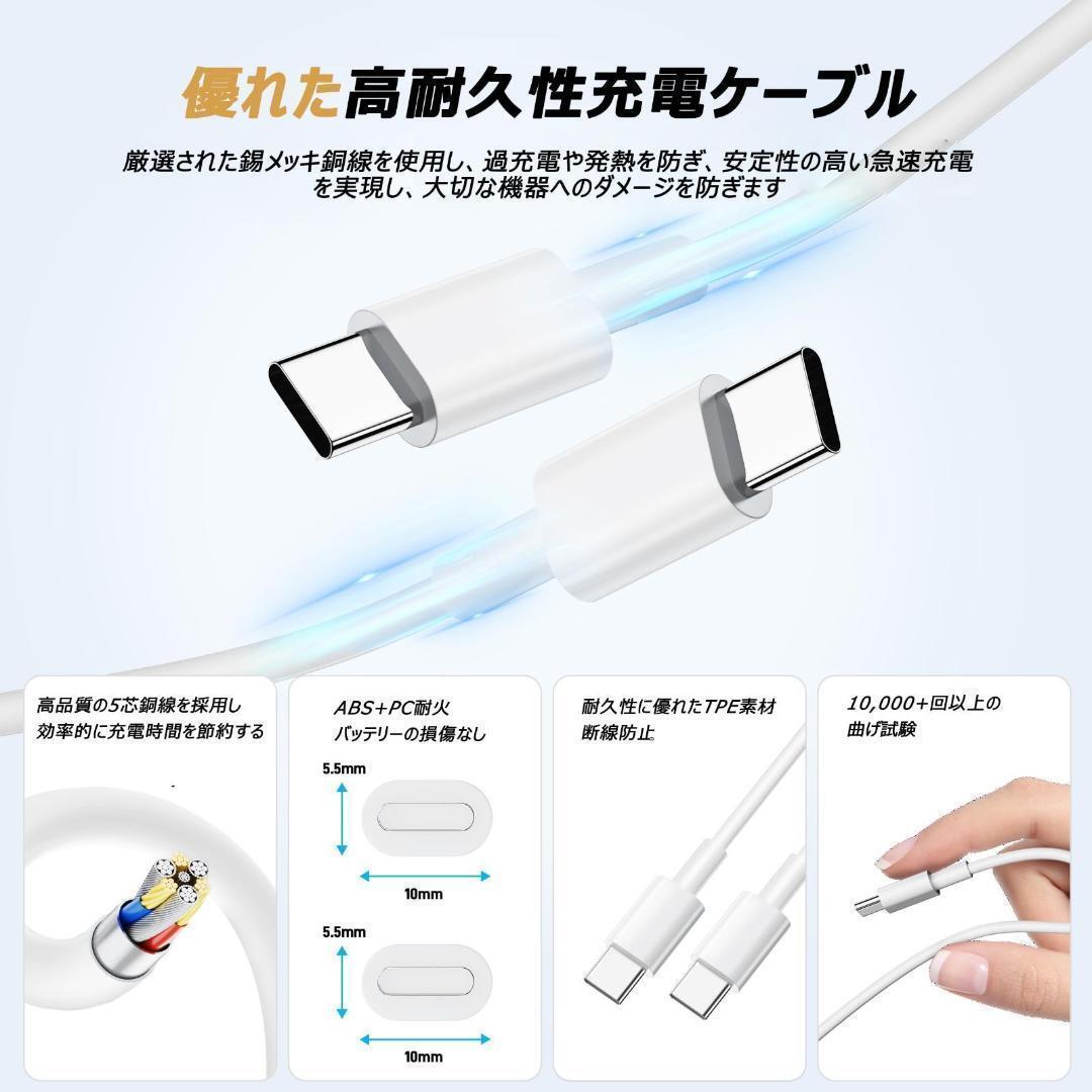 【2M Type-C to Cケーブル2本付き】:弊店はお客様の購入体験を何より優先で、充電器一個でケーブル1本付きで、本商品は2本付き。ケーブル一本一本、全ては優れたTPE素材を使用、耐久性は一般ケーブルより15倍も向上。断線にくく、12万回以上の厳しい曲げテスト・約50kg以上の重さを持ち上げるテストにも通過、日常用でしたら折れる心配はありません。そして、ケーブル自体にも認識チップが搭載、Iphone15以後のiOSバージョンも完全にサポートされます。