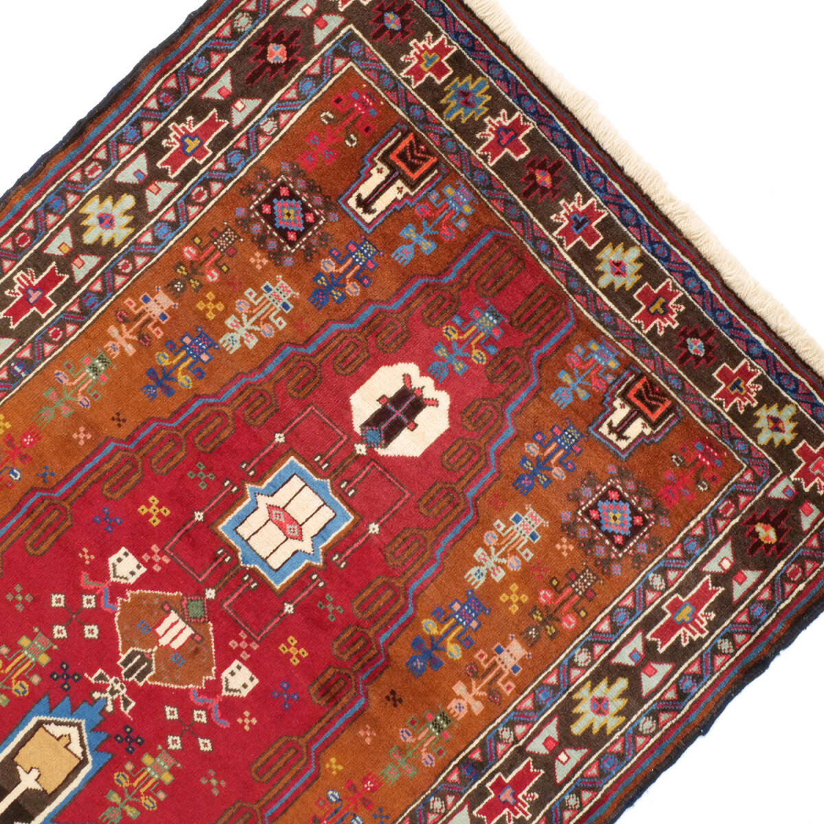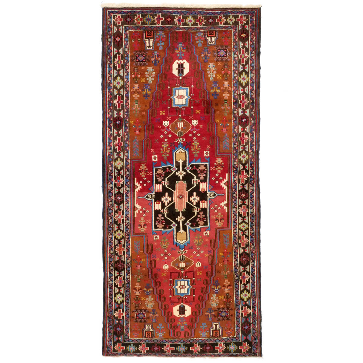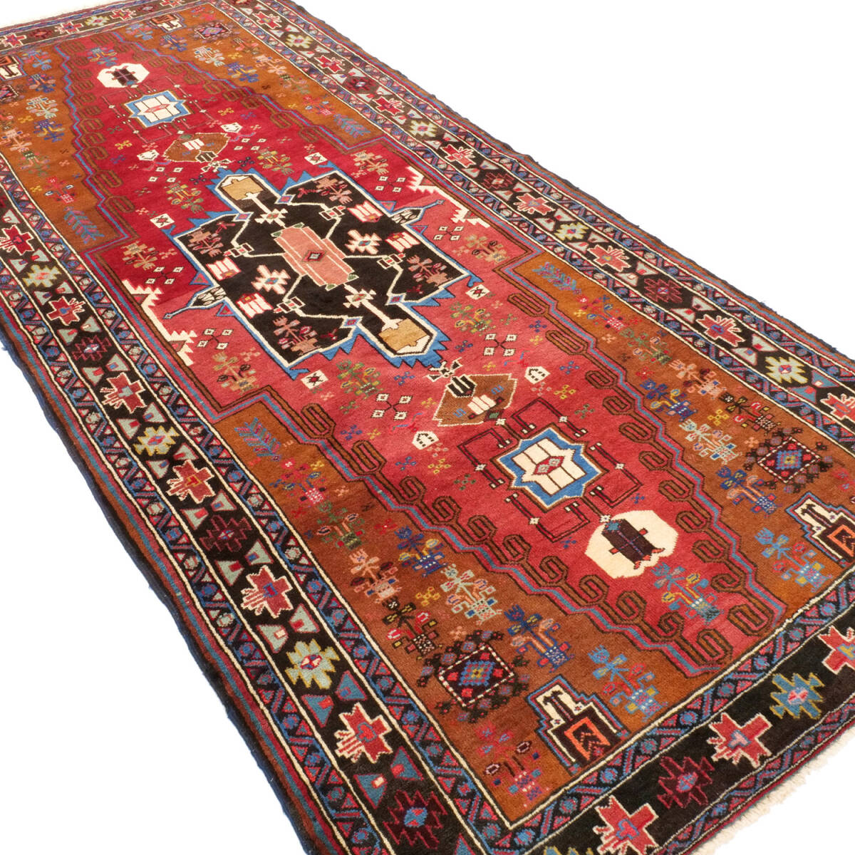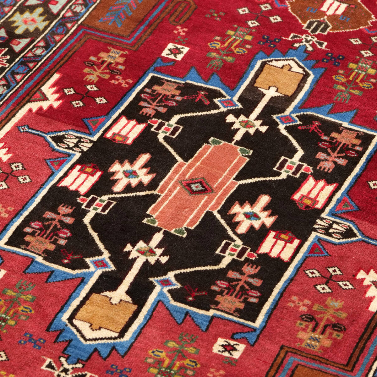 1970年代に制作されたザーボル産のセミアンティークラグです。中央に配置された黒地の大きなメダリオンが力強い存在感を放ち、赤のフィールドを背景に周囲へと華やかに広がっています。フィールドには小花や幾何学的意匠が点在し、端正ながらも豊かな装飾性を備えています。広めのサイズで、リビングや空間の主役として敷くだけで格調を高める一枚です。