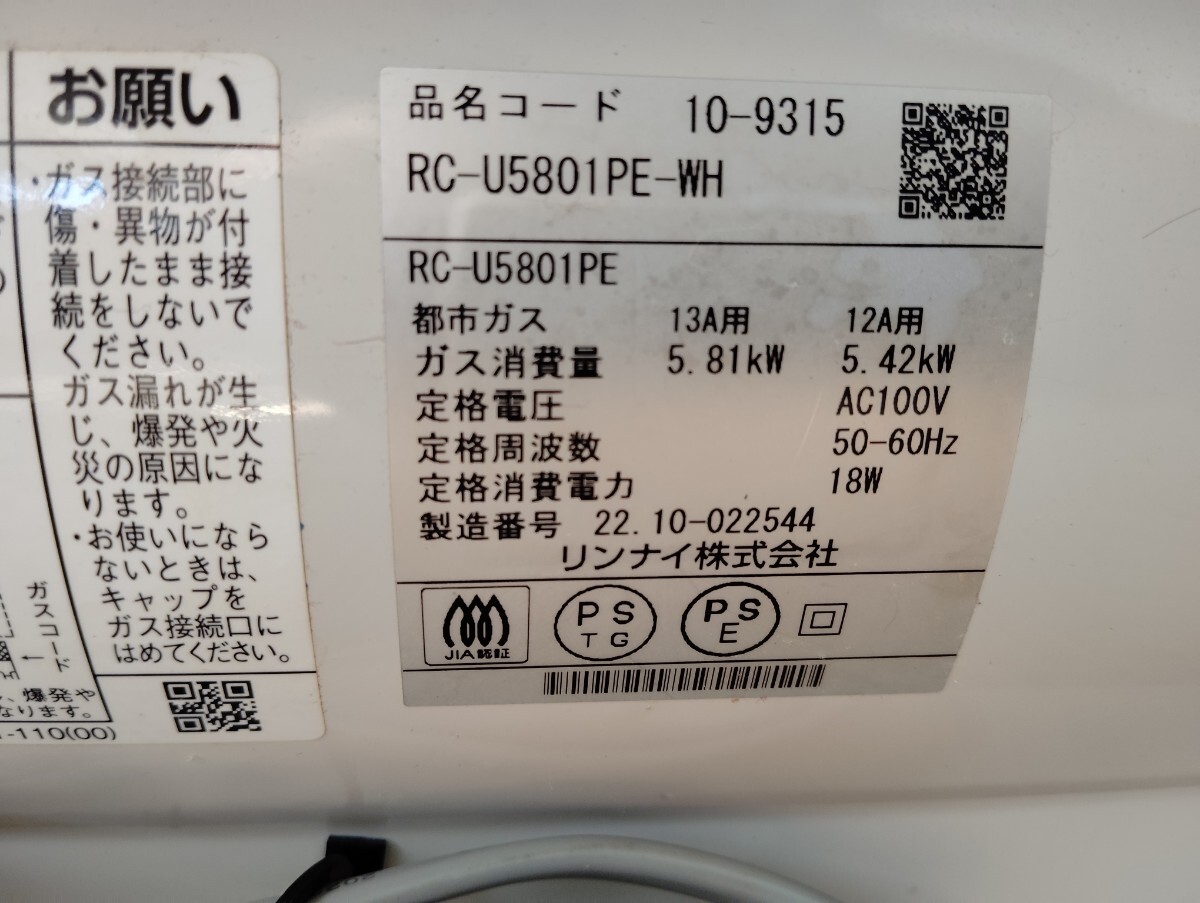 中古・Rinnai リンナイ ガスファンヒーター RC-U5801PE-WH 都市ガス 2022年製になります。