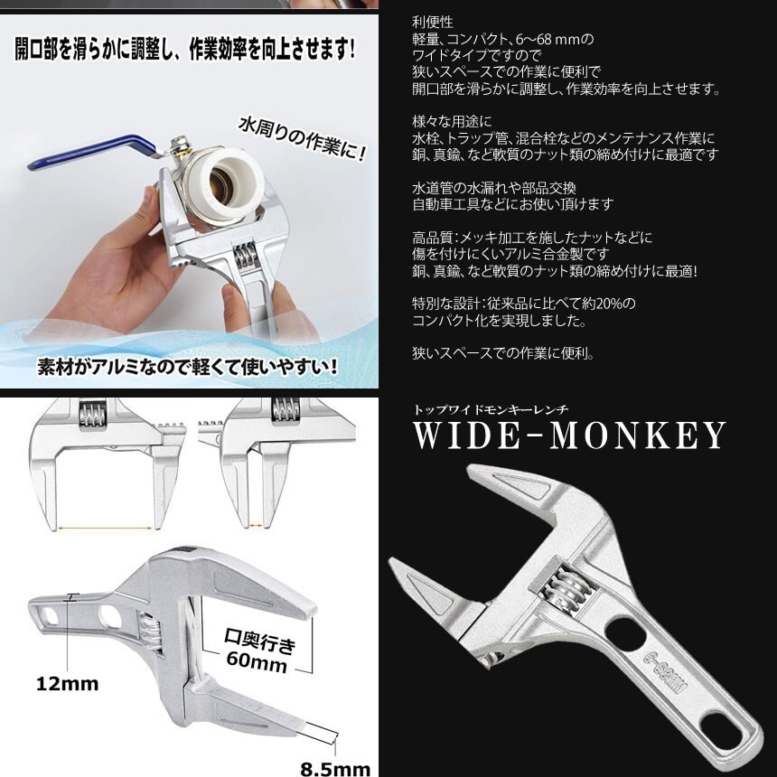 | 送料無料!!! 送料及び下記のご案内をご確認の上、ご入札お願い致します。 離島地域を除く九州、四国、本州まで送料無料。 ※北海道は+550円、離島地域及び沖縄県は+2500円にて承ります。(発送前に加算) ※画像内にカラー及びサイズ等の選択が可能と記載がある場合がございますが、 お届けする物はタイトルまたは商品説明文に記載の物です。 ★※注文後のカラー変更や異なるカラー・サイズ指定等は一切承っておりません。※★※仕様(ロゴデザイン/ロゴ有無等も含む)は予告なく変更する場合があります。 ※多少の汚れや小傷がある場合がございますがご了承ください。 梱包は簡易包装ですので、箱の角落ち等はご了承願います。 軽量、コンパクト、6?68 mmの ワイドタイプですので 狭いスペースでの作業に便利で 開口部を滑らかに調整し、作業効率を向上させます。 様々な用途に 水栓、トラップ管、混合栓などのメンテナンス作業に 銅、真鍮、など軟質のナット類の締め付けに最適です 水道管の水漏れや部品交換 自動車工具などにお使い頂けます ※詳細は画像をご参照くださいませ