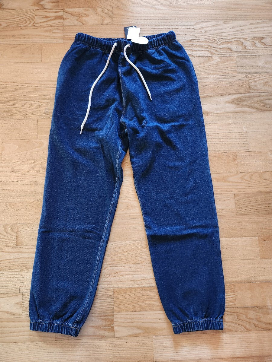 ◎商品説明 インディゴ染めのスウェットパンツです。 生地は11oz程よい厚さで、2色のステッチ糸でオシャレに仕上がっております。 ウエストはゴムとヒモ、裾はゴム、裏毛生地でポケットは両サイドと後ろに1つ付きます。