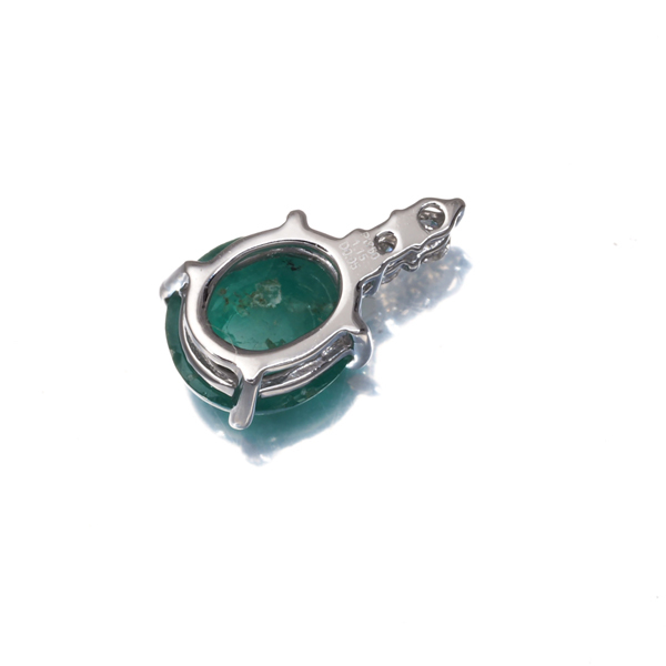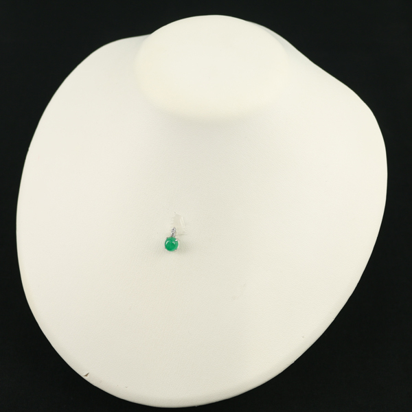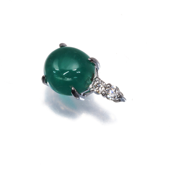 艶やかな表情と色鮮やかなグリーンの輝き美しいカボションカットのエメラルドと共に2石の上質メレダイヤを添えたペンダントトップです。 |