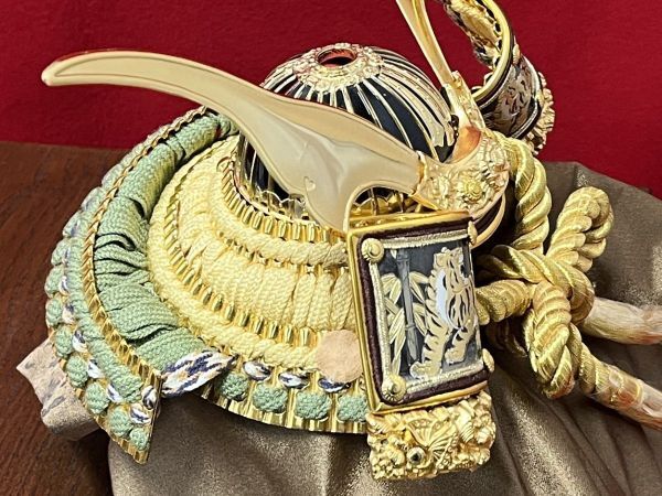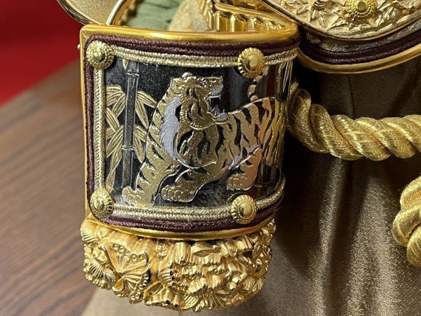 | 【M552】古代造形兜 斑鳩の里 皇宸 8号 彫金細工 正絹織 収納木目猛虎 剣付 金色総覆輪仕上げ 伝統工芸 五月人形 兜飾り b | ||