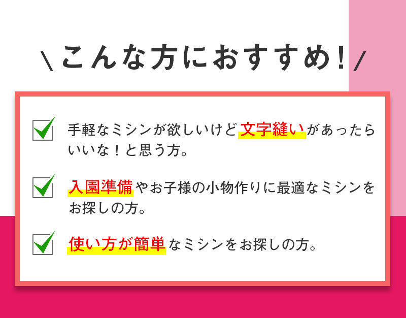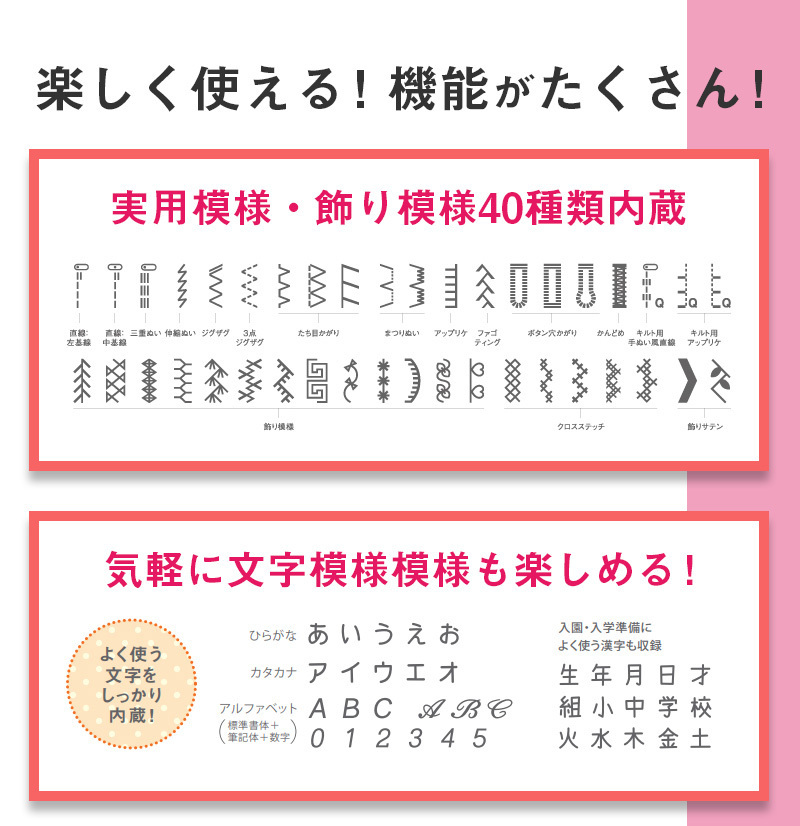 ■文字縫いも模様縫いも思いのまま、手軽に使える簡単高機能ミシン!