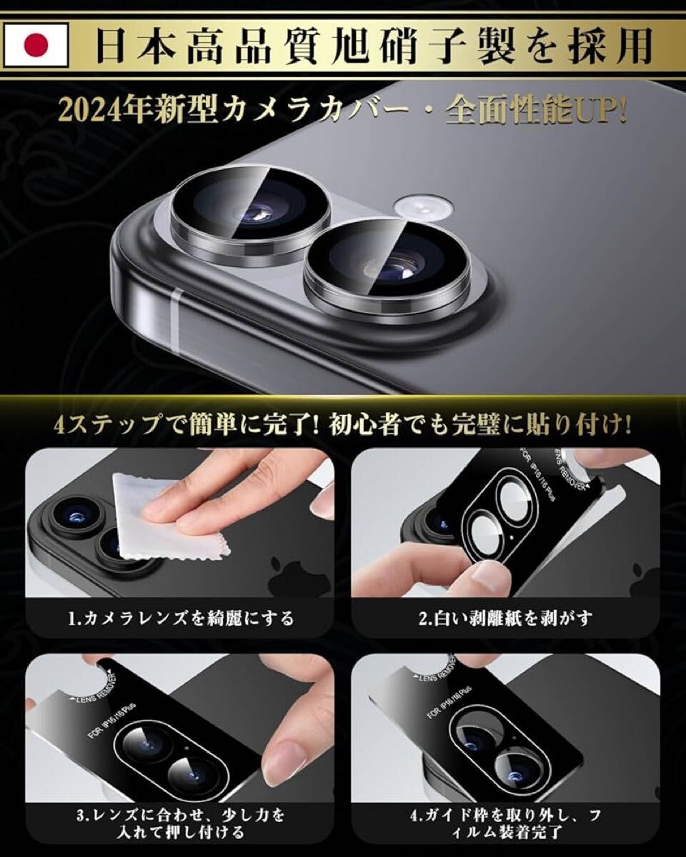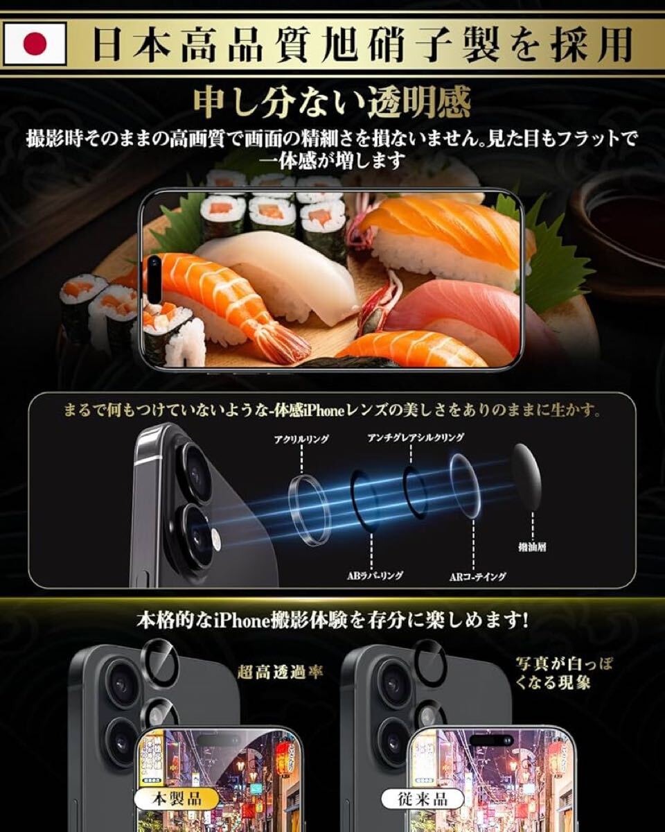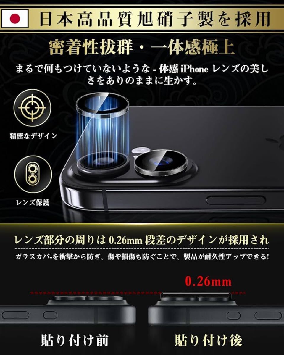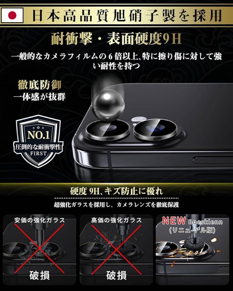 Boesklenn iPhone16 カメラ保護 フィルム【日本旭硝子素材製/露出オーバー防止/防塵/航空用アルミ合金/硬度9H/全面保護/高透過率】