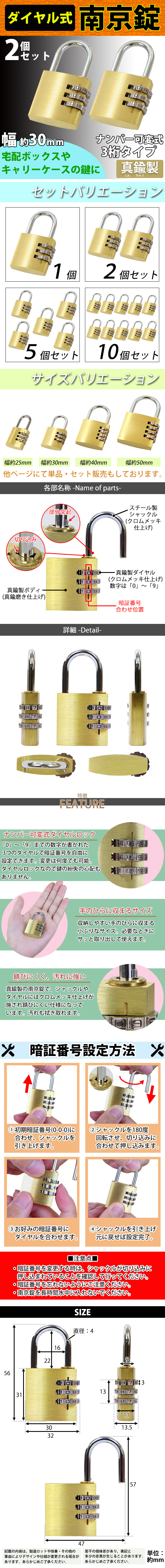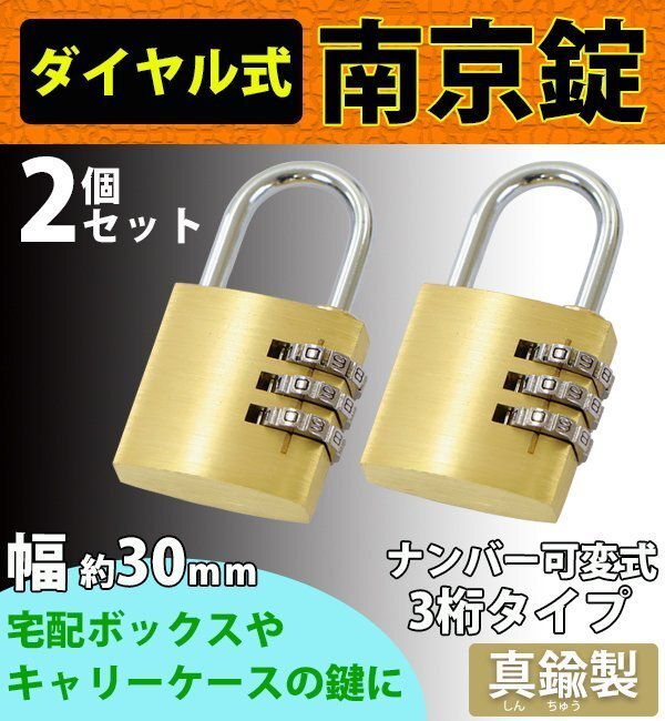 | 商品名 | 送料無料 ダイヤル式 南京錠 幅約30mm 2個セット シャックル径約4mm 真鍮 3桁タイプ 可変式 ダイヤルロック ダイヤル錠 コンビネーション パド ロック ガードロック チェンジロック 盗難防止 防犯 暗証番号 宅配ボックス ロッカー ポスト キャリーケース nankinl302p |