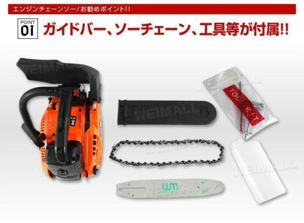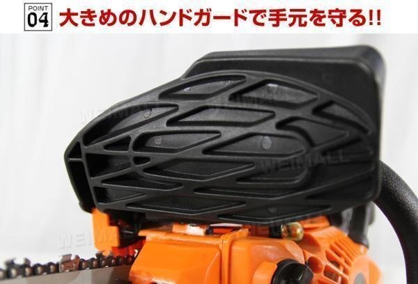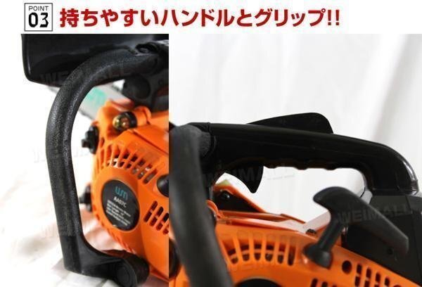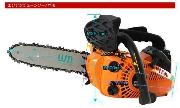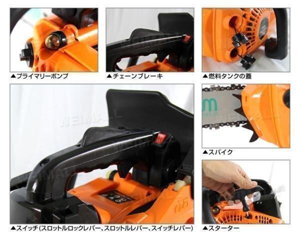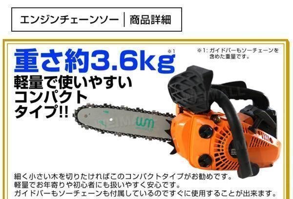 | コンパクトサイズ! 小型・軽量で使いやすい10インチエンジンチェーンソーです。 軽量化されたデザインで、エンジンの始動性を高めた、初心者にも扱いやすい! 薪作り、伐採作業まで幅広くお使い頂けます! お庭、公園、農地や果樹園などで活躍します! 【商品仕様】 ・2ストローク 空冷式 ・排気量:25.4cc ・ガイドバーの長さ(約):25cm(10インチ) ・燃料:混合物(ガソリン:2 ストロークオイル25:1) ・燃料タンク容量:310ml ・オイルタンク容量:210ml ・キャブレター:バルブ式 ・潤滑システム:調節器が付く自動バルブ(本体潤滑) ・サイズ(約):幅25cm×奥行き22.0cm×高さ25cm ・重量(約):3.6kg ・カラー:オレンジ 【商品内容】 ・本体 ×1 ・ソーチェン ×1 ・ガイドバー10インチ ×1 ・ガイドバーカバー ×1 ・工具 【注意事項】 ・本商品を使用した際に発生したトラブル、事故につきまして、当社は一切の責任を負いかねます。 ・当商品は入荷の時期によりカラー、仕様などが変更される場合があります。ご了承下さい。(色指定はできません。) |