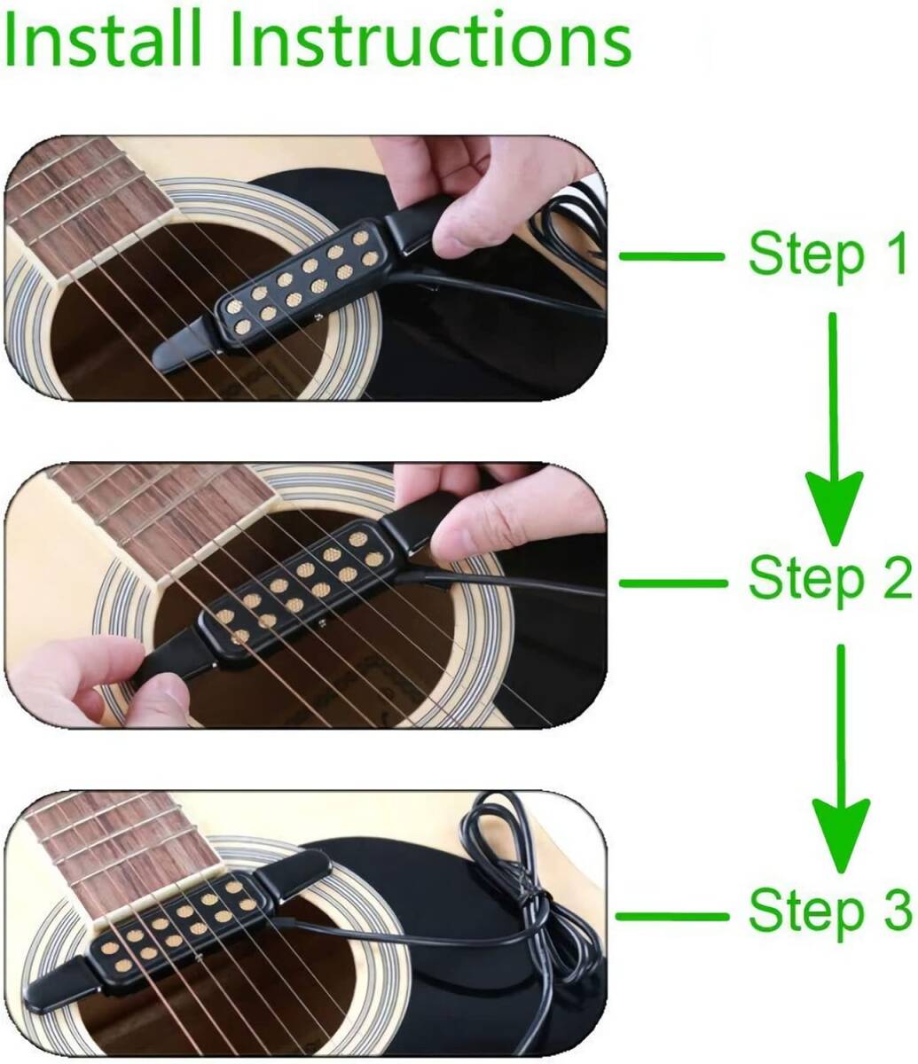 アコースティックやガットギターのサウンドホールに設置するだけです。 (穴あけ加工なしで取り付けられます)これだけでエレアコ、ドホールのトップエレガットに変身します。